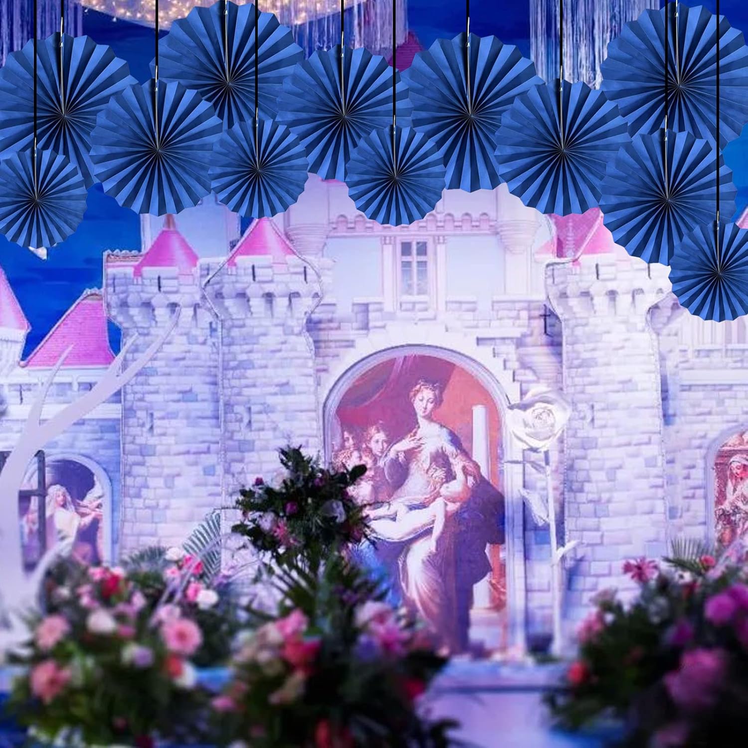 HQZ Blue Party Hanging Fans DIY Set - 12pcs Paper Fans, Pinwheels, Craft for Wedding, Birthday, Christmas Party Decoration