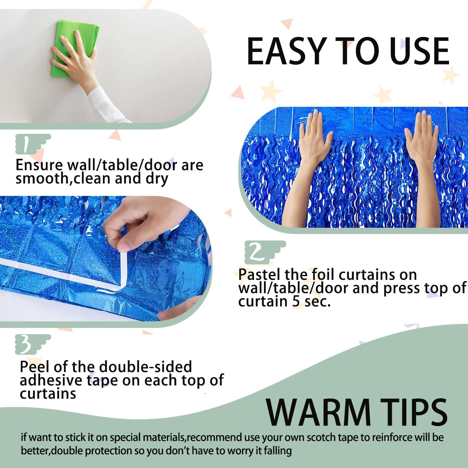 - Easy To Use:This foil backdrop comes with double sided tape on the back of them, what you need to do is just gently take it out of the package, peel the tape off then paste the fringe curtain on the top of wall or door