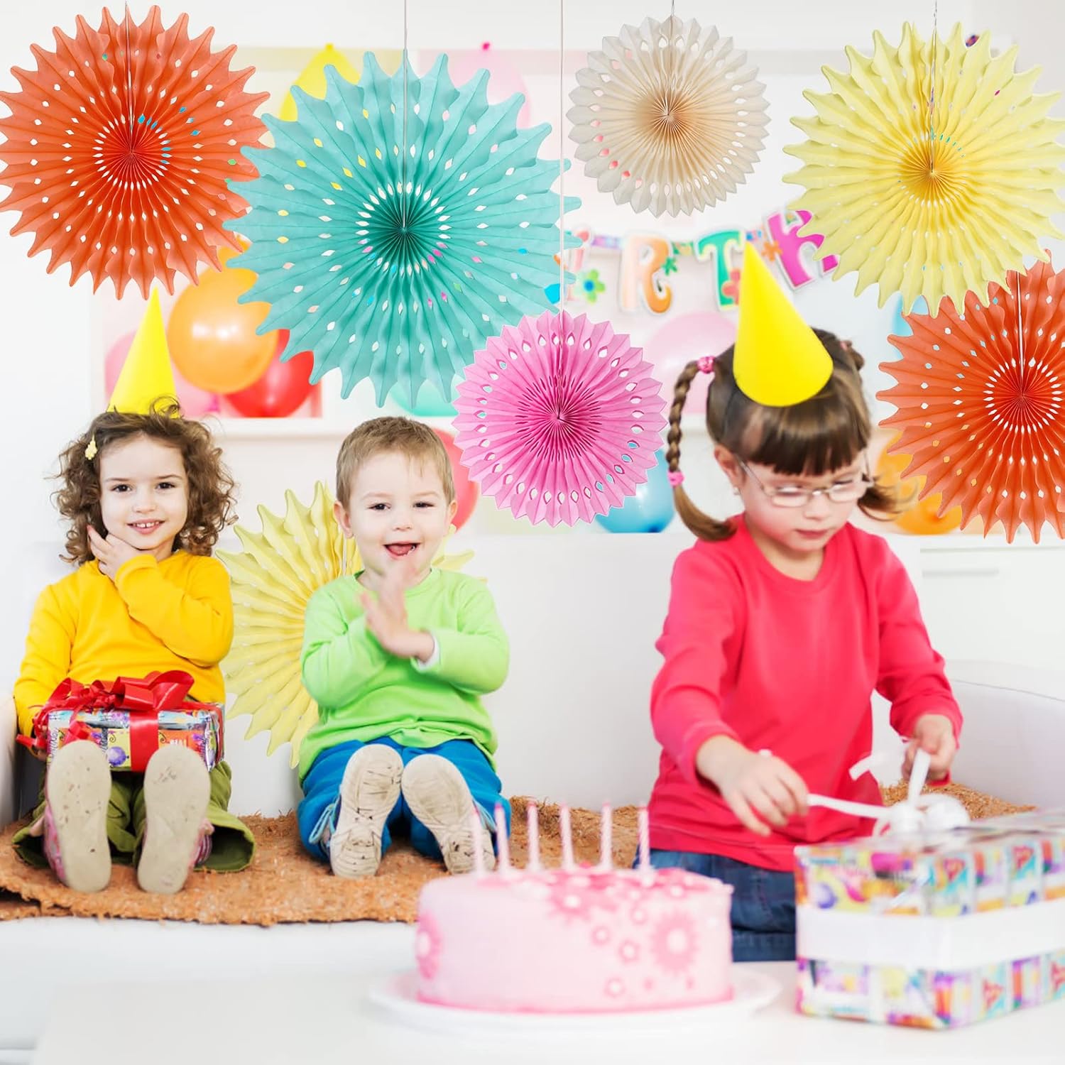 - Vibrant and Lively: Add a burst of color to your celebrations with our 11 PCS Colorful Hanging Paper Fans Decoration. These beautiful fans feature a variety of vibrant colors that will instantly uplift and energize any space.