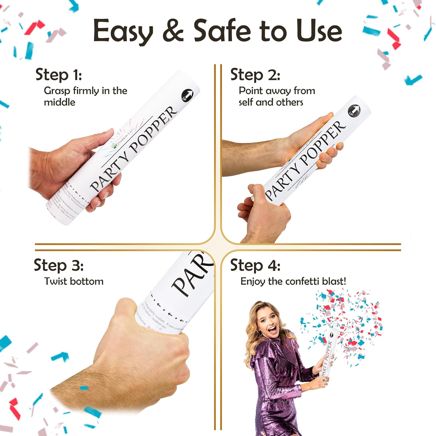 - SAFE & EASY TO USE – Designed for family-friendly fun, these air-powered confetti poppers require no fire or batteries. Just twist to release a vibrant paper burst—ideal for teens, adults, schools, and crowd-safe events