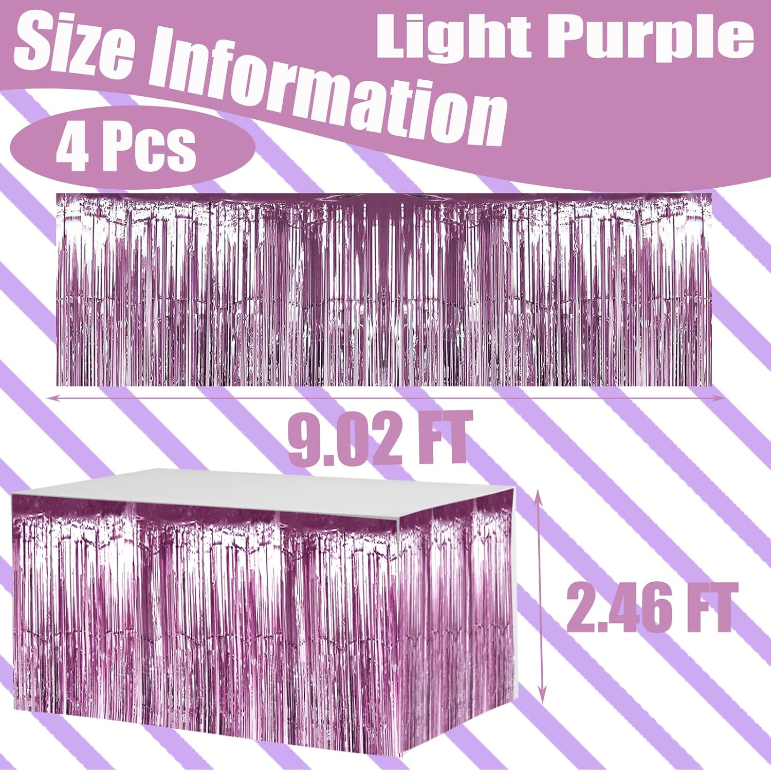 4 Pack 29x108 Inch Metallic Foil Fringe Tinsel Table Skirts for Rectangle Tables Streamer Backdrop for Wedding, Birthday, Parade Floats, Christmas, Halloween Party Decoration(New Light Purple)