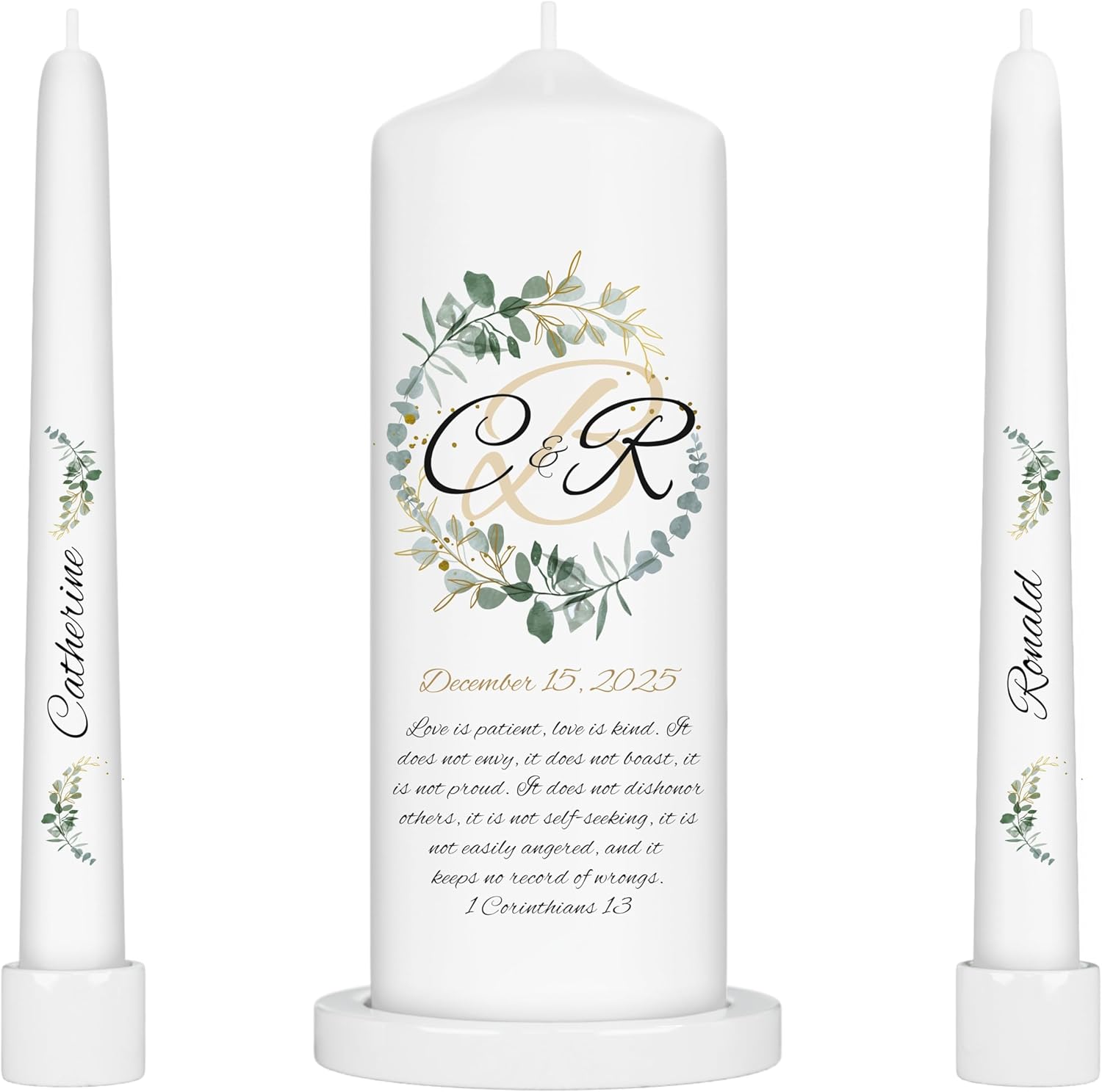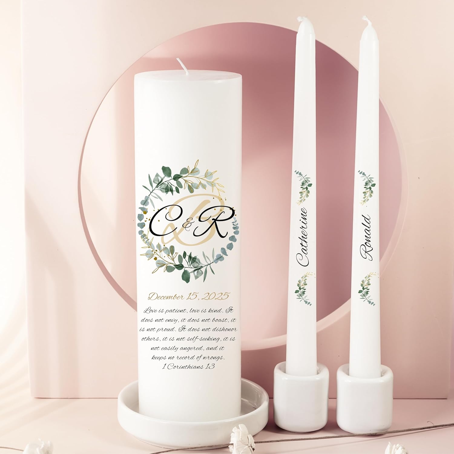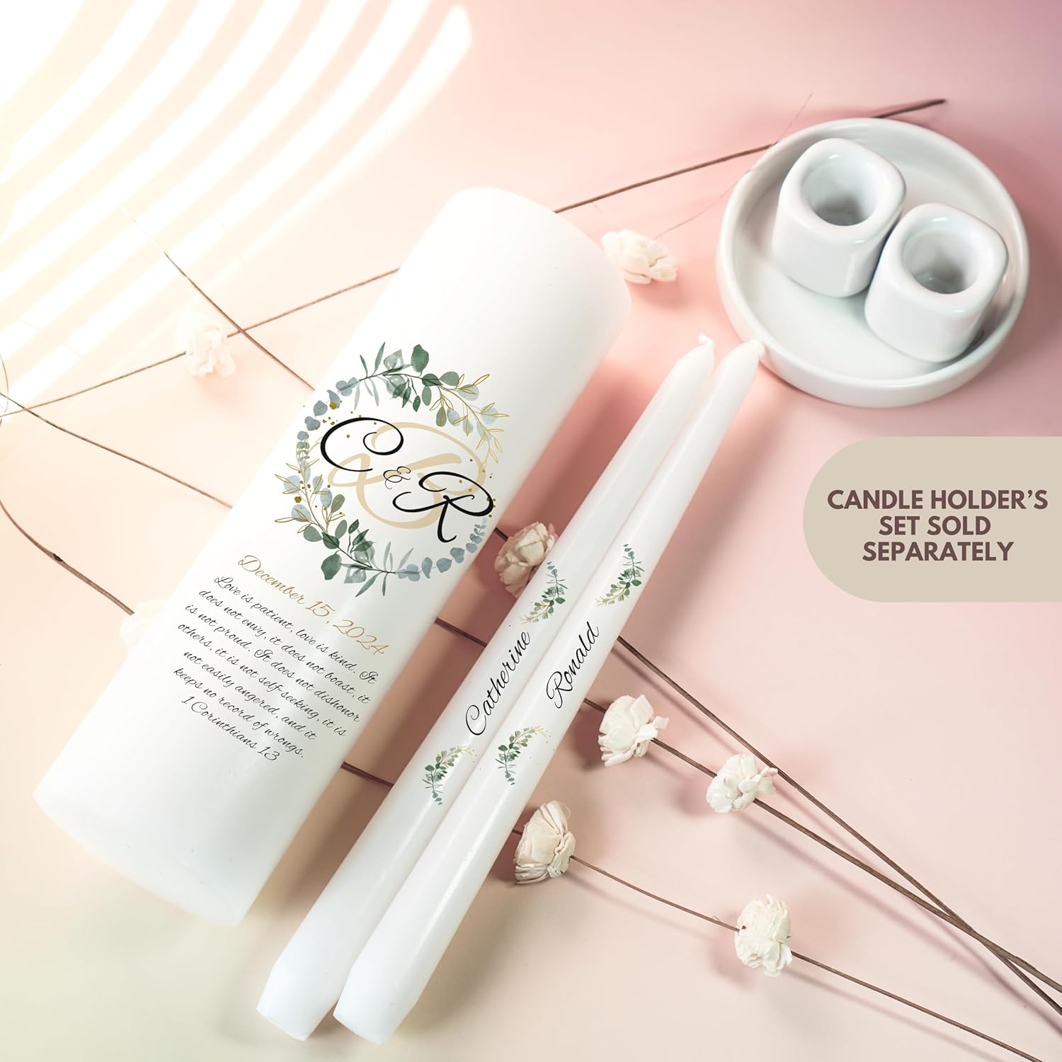 Unity Candles for Wedding, Modern Unity Set, Custom and Personalized Pillar and Taper Candles with Bible Quote, Unscented White Premium Wax, Religious and Wedding Ceremony, Special Events (Zinnia)