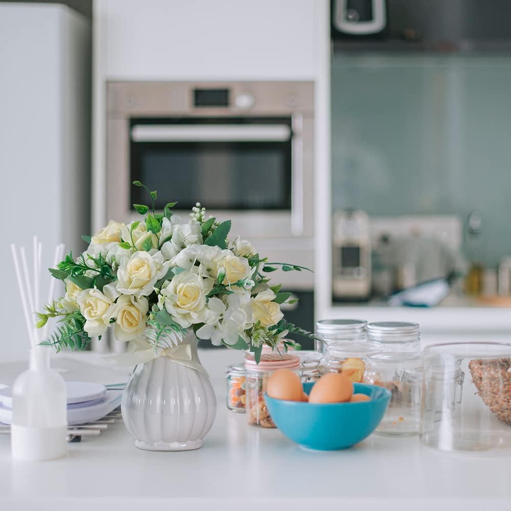 - [ MATERIAL ]: Artificial silk flowers and leaves,wire wraped in plastic stem, Rose bouquets in ceramic vase.