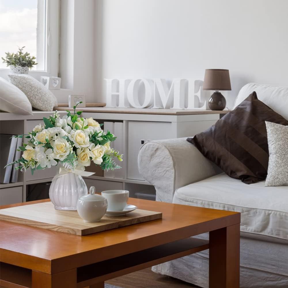 LESING Artificial Rose Silk Hydrangea Flowers Bouquets with Vase Rustic Fake Flowers for Home Decoration Table Centerpiece (White)