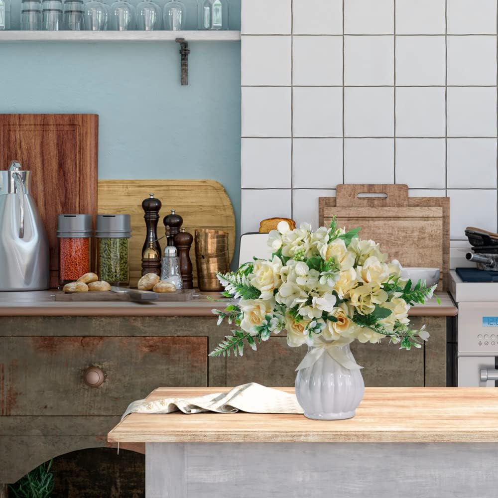 - [ MATERIAL ]: Artificial silk flowers and leaves,wire wraped in plastic stem, Rose bouquets in ceramic vase.