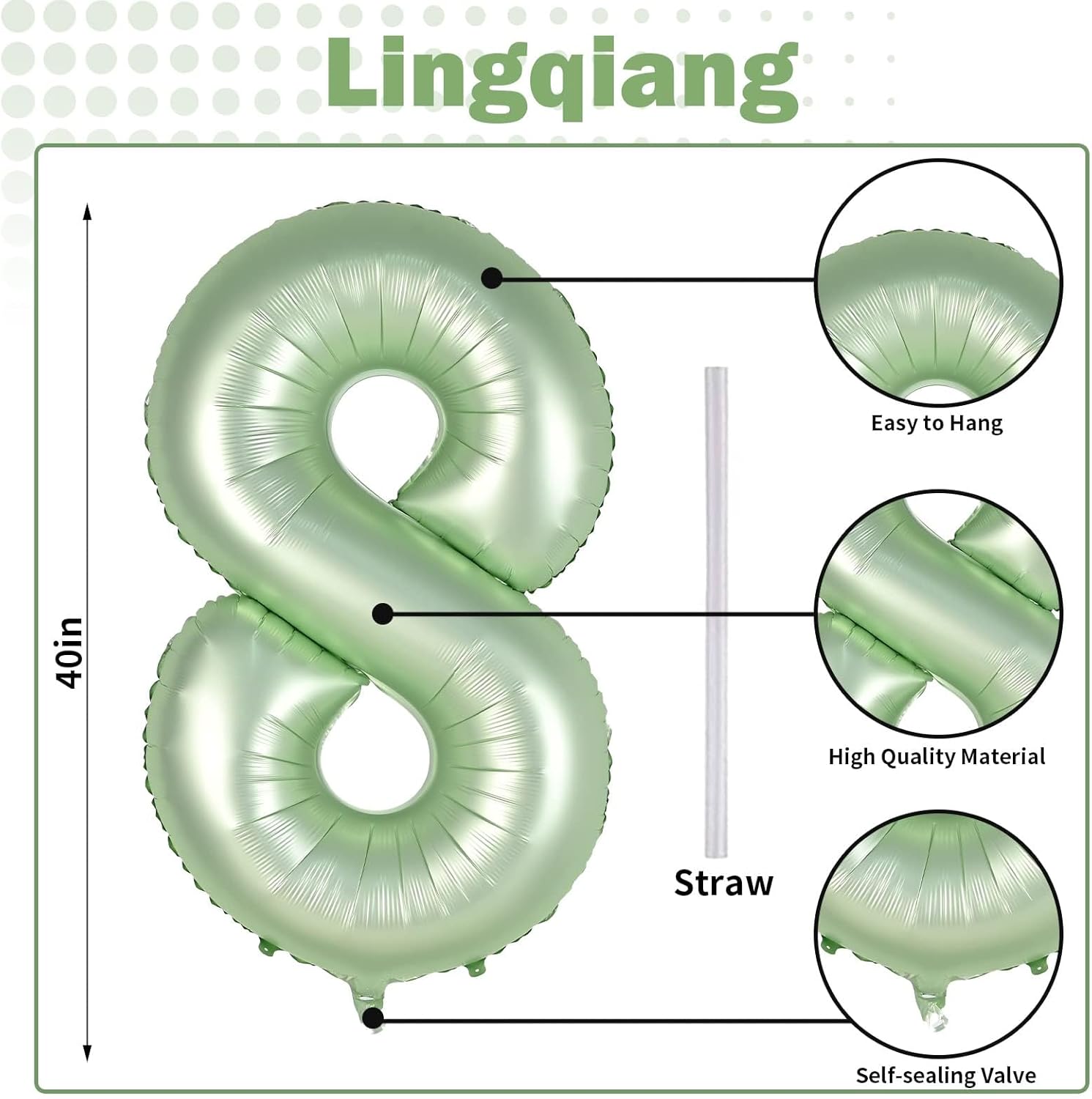 - š Easy to Inflate š - The big sage green number 8 foil balloons have self-sealing valve does not need to be knotted for easy inflation and deflation. It can be inflated with air or helium. When filled with helium, the balloons can float in the air; after filling, press the valve of the digital balloon to seal it. It can be reused. Do not throw away after use!