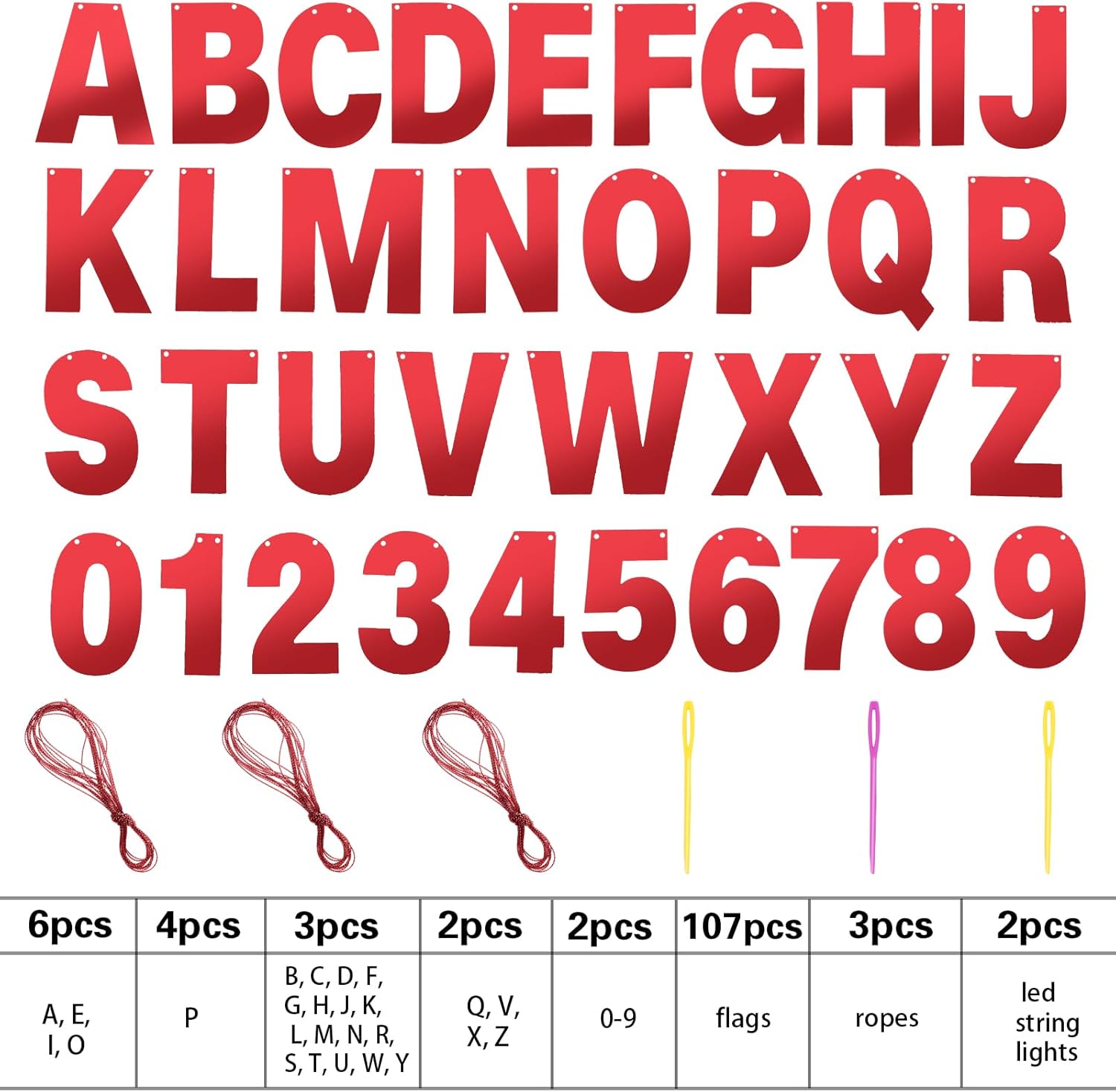 TaoBary 112 Pcs DIY Letter Custom Banner Glitter Customizable Banner Kit Including 107 Letters and Numbers 3 Rope for Valentine Birthday Party(Bright Red)
