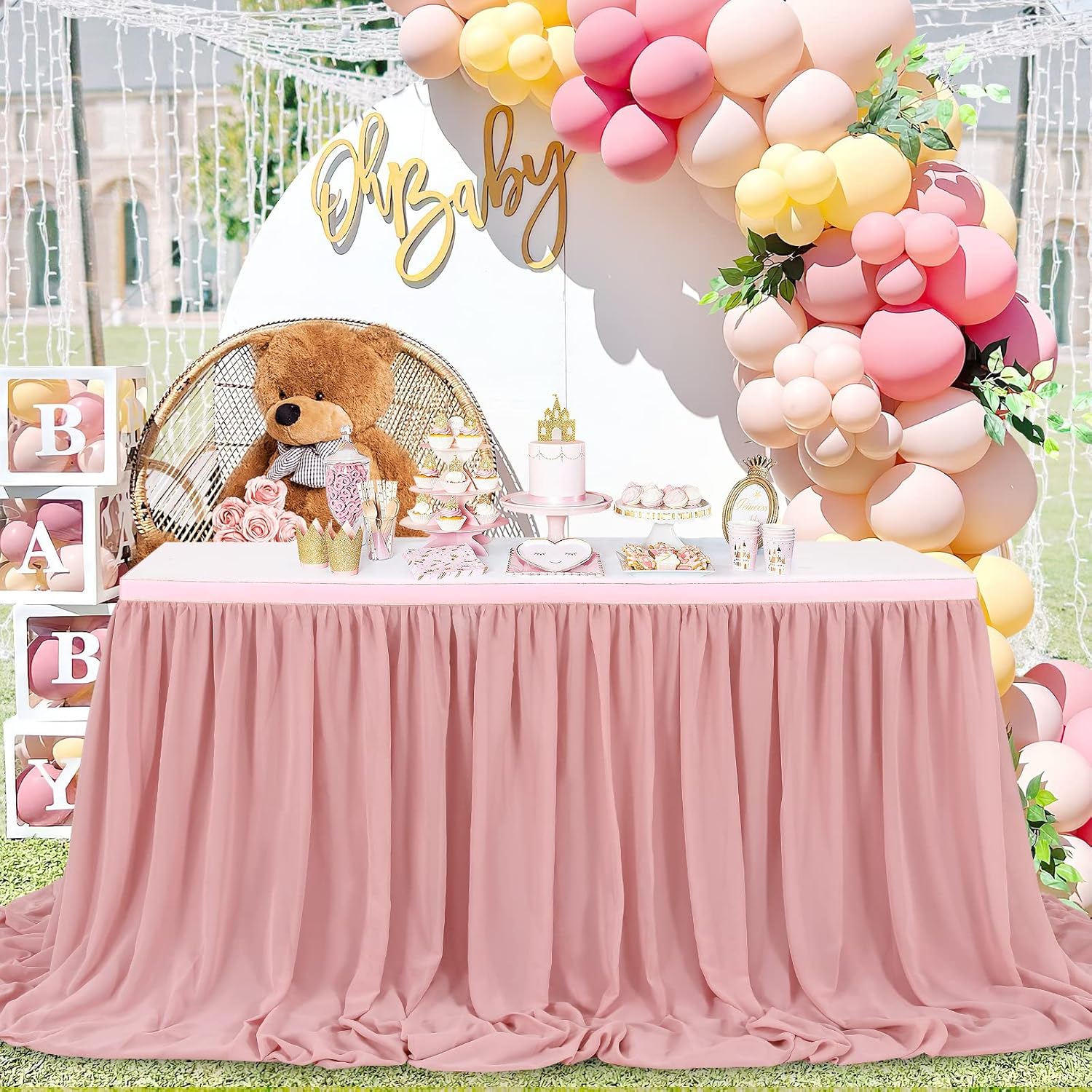 - π‘ Dusty Rose Table Skirt Material: The extra long chiffon table skirt is made of Sheer Chiffon which is wrinkle-free, soft, and with a nice drapery. Table skirt both robust for kids birthday party supplies and elegant if used for wedding decoration.