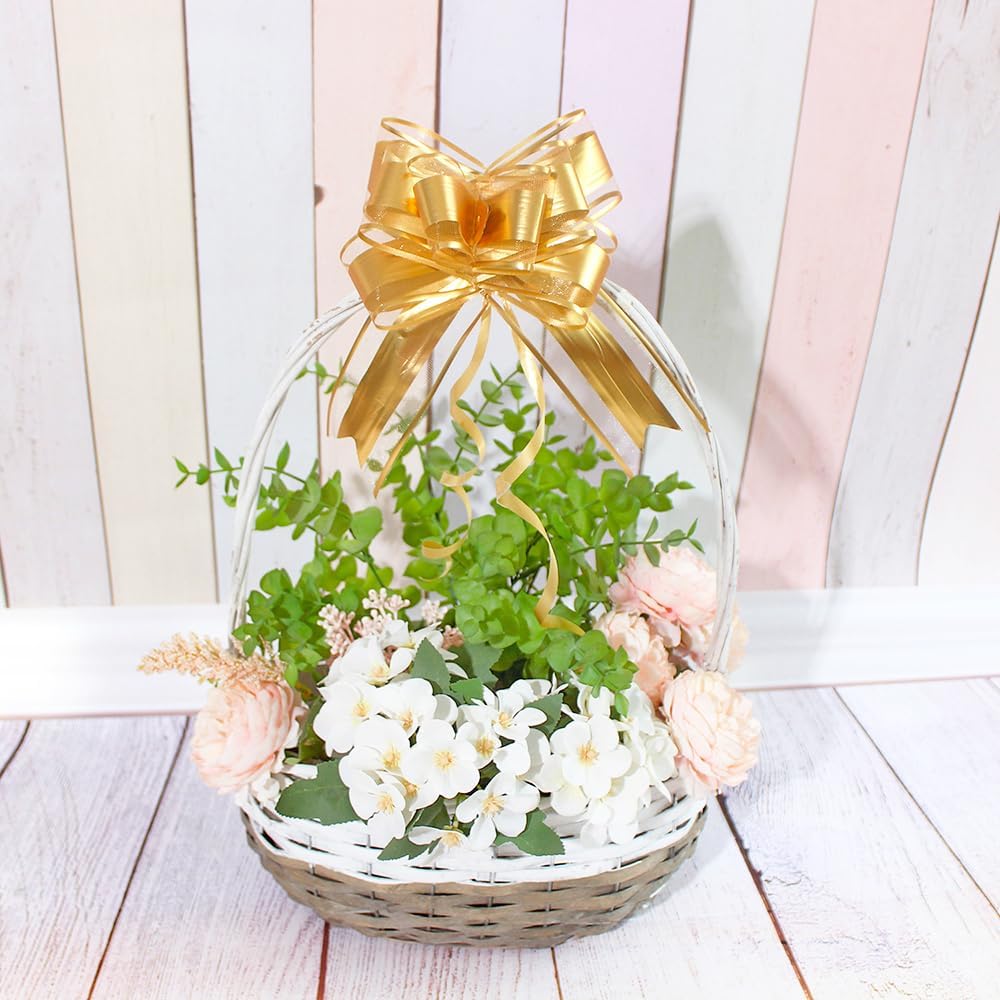 - PACKAGE: Each package include 15 gold pull bow, and their assembled diameter is 6 inch. Our pull gift bows are made of high-quality materials when using the pull gift bow can be assembled within a second, when not in use can also be flattened for easy storage