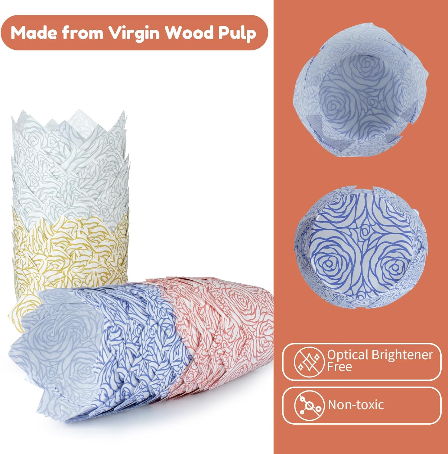 - High-Quality Paper Material: Crafted from optical brightener free and non-toxic virgin wood pulp, our cupcake liners are safe, reliable, and eco-friendly. The sturdy paper material ensures that the liners maintain their shape and integrity during baking, guaranteeing perfect cupcakes every time.
