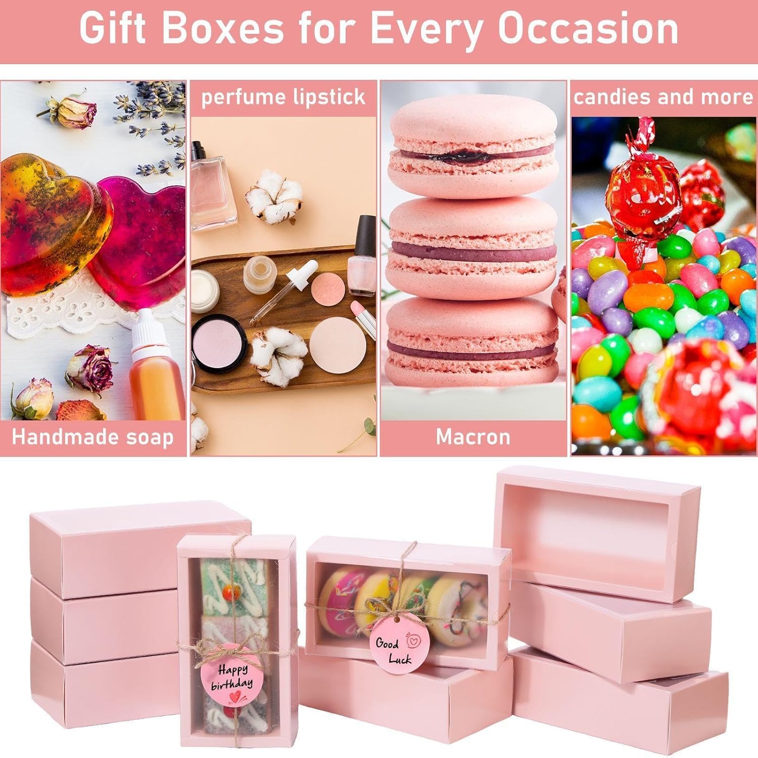 Roowest 50 Sets Kraft Soap Boxes Rectangle Packaging Box with Window Homemade Gift Box with Blank Tags and Jute String for Jewelry Candy Wrapping Party Favor(6.3 x 3.5 x 2 Inch,Pink)