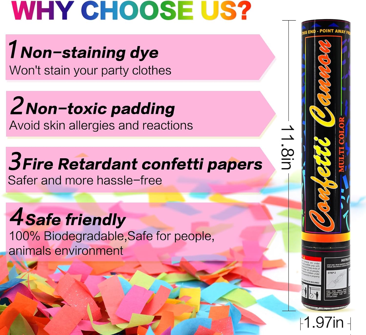 - 【SATISFACTION GUARANTEED】Your experience matters to us. If you're unhappy with our confetti cannon, please reach out. Our team will swiftly address any concerns to ensure your full satisfaction. Risk-free shopping with exceptional customer service.