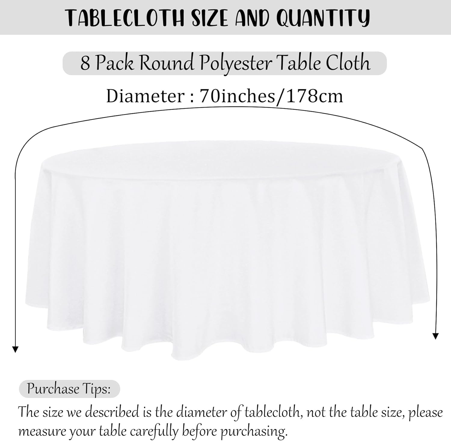 - Package Include: you will get 8 pieces white polyester round tablecloth, enough quantity is suitable for wedding banquets and various parties, the size of each tablecloth is approximately 70 inches / 178 cm, which is large enough to cover 30" or 48" round tables, classic in color and exquisite in design, the solid color makes them suitable for various occasions, instantly heightening the elegance of your table.
