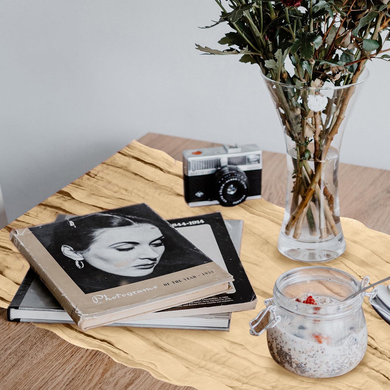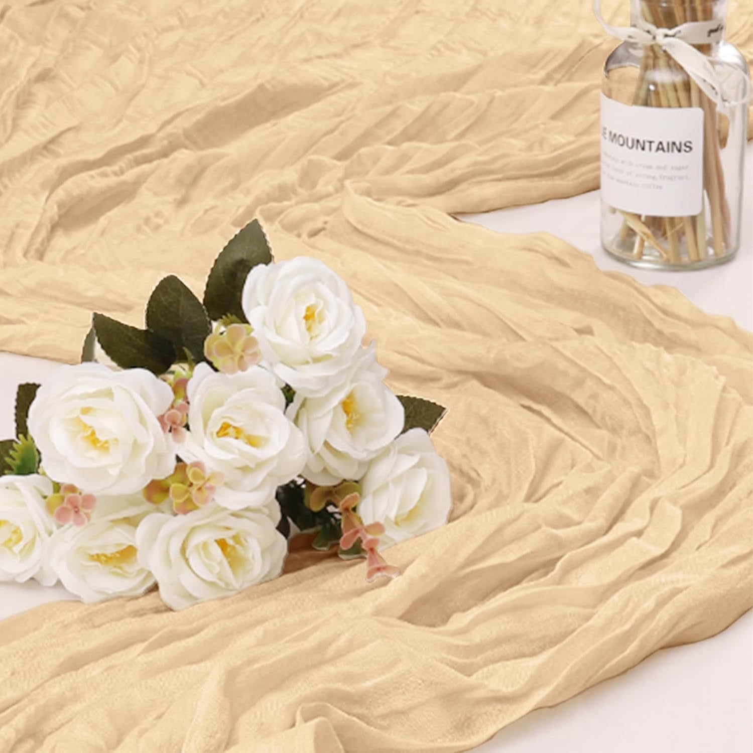 - 【Soft Material】: Made of high quality polyester, soft to touch, comfortable and durable. Wrinkled design cheese cloth farbic, delicate edges and stitches, adopts seamless technique makes this sheer table runner more graceful than traditional fabrics. Our cheesecloth wedding table runners are durable, the colour stays for a long time, does not fade and can be reused.