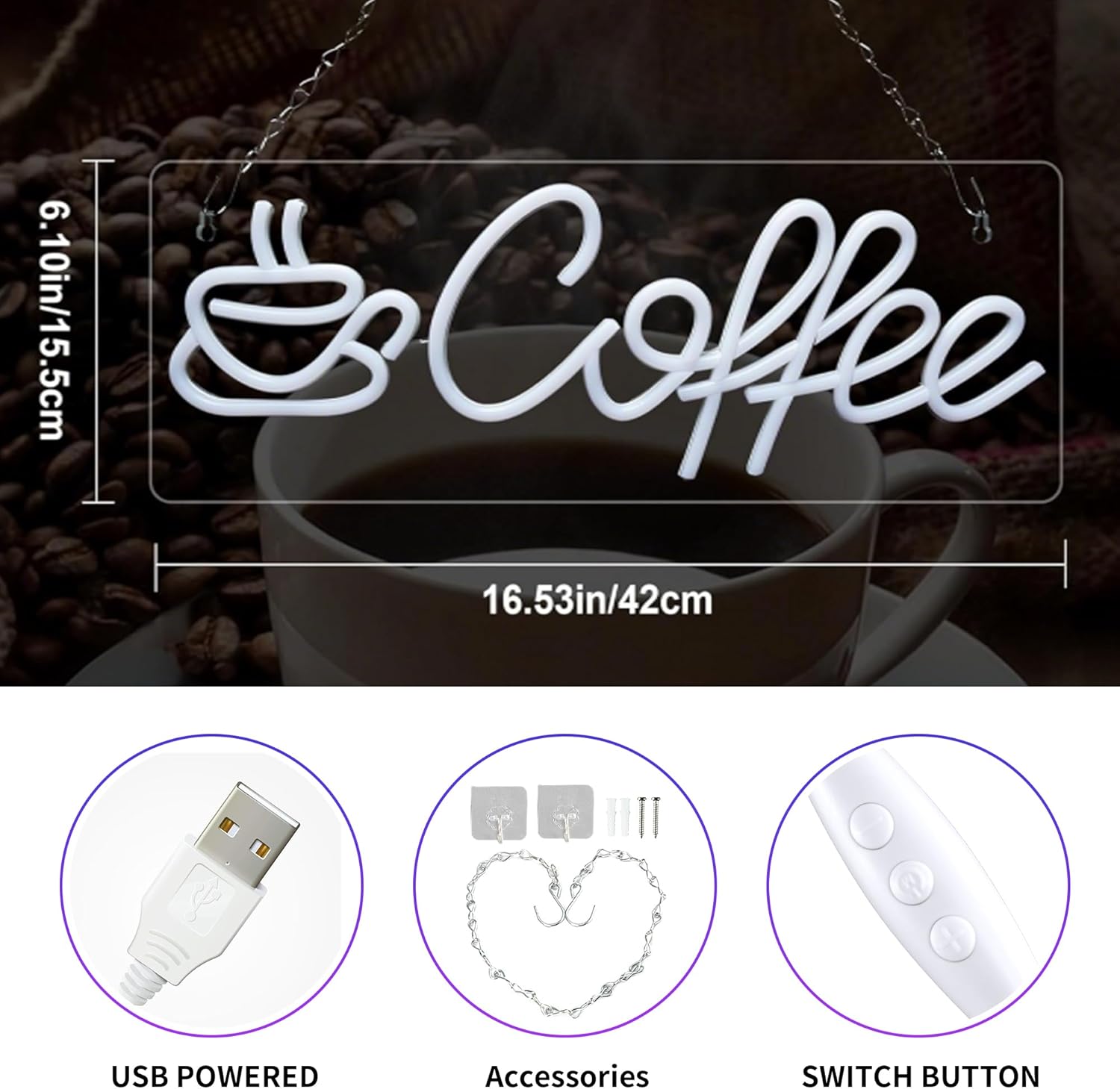 - 🤞 Easy to install: cute coffee bar sign size is 16.5X 6 inches, Mounting holes are pre-drilled on the acrylic backboard you can use the provided hooks and metal chain to fix or suspend the coffee neon sign on the wall, window and front door. Having a 6.5 foot long cable with on/off switches, so you don't need to unplug the coffee led sign every day, and you can control the on/off and brightness at any time, which is very convenient