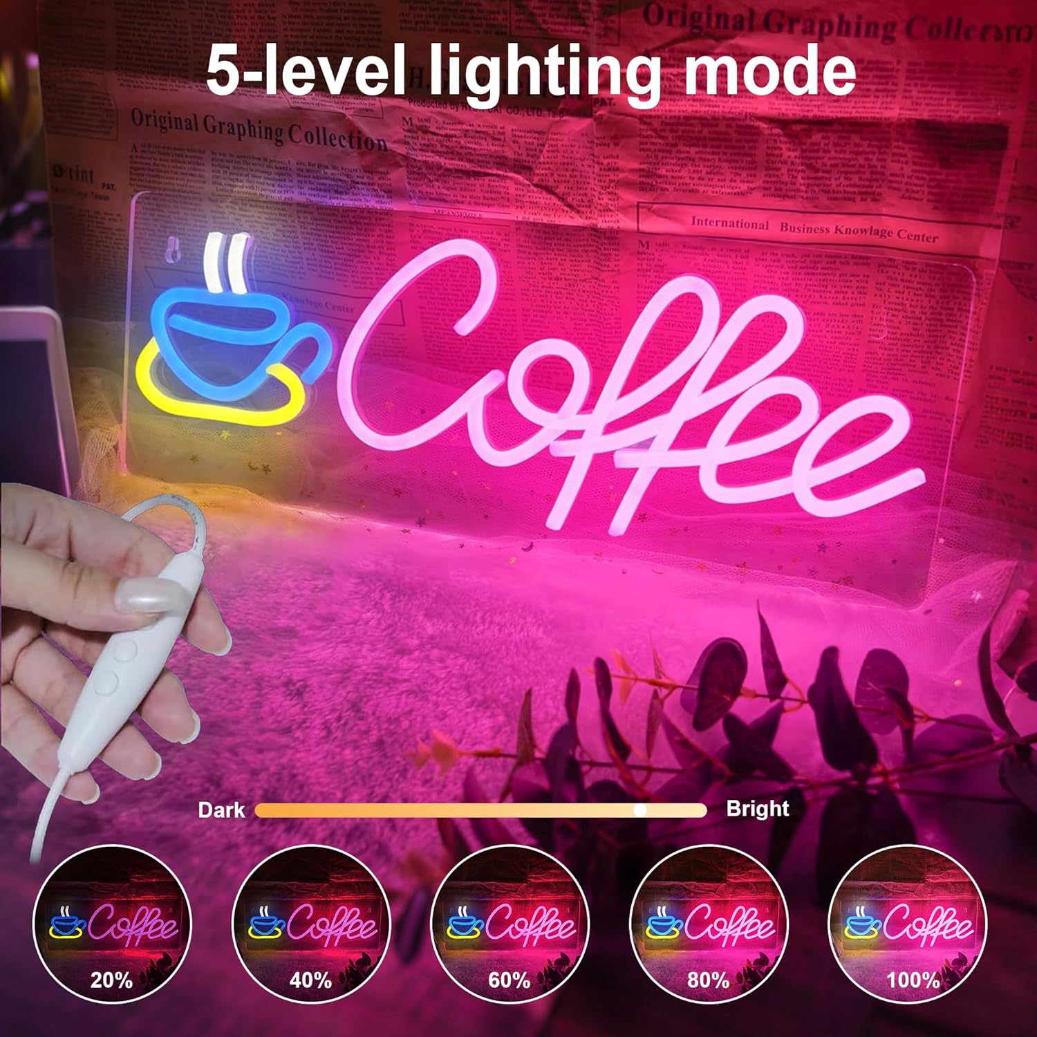 - 👍【Adjustable Brightness】This coffee neon signs comes with dimmer switch that allows you to select a 5-level lighting mode. The middle button controls the switch,and the upper and lower buttons can adjust the brightness (10 %-100 %). When you turn it off and then reopen, the coffee neon light will return to the previous state without pressing the button.