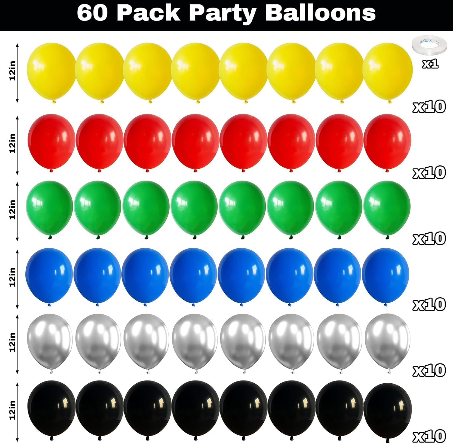 60 Pack Balloons Red Yellow Green Blue Black Party Balloons with Metallic Silver Helium Balloon, Rainbow Colorful Latex Balloons Set for Kids Birthday Carnival Themed Decorations