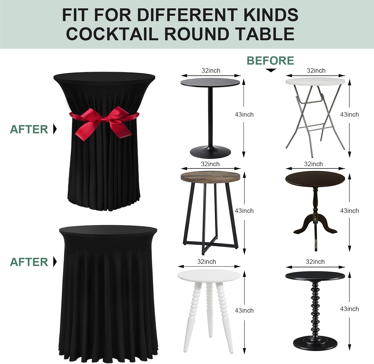 - Skirt Design - These are uniquely designed cocktail table covers that fit any tall round table with a diameter of approximately 32 inches and a height of approximately 43 inches, whether the bottom is an X style or a single center column