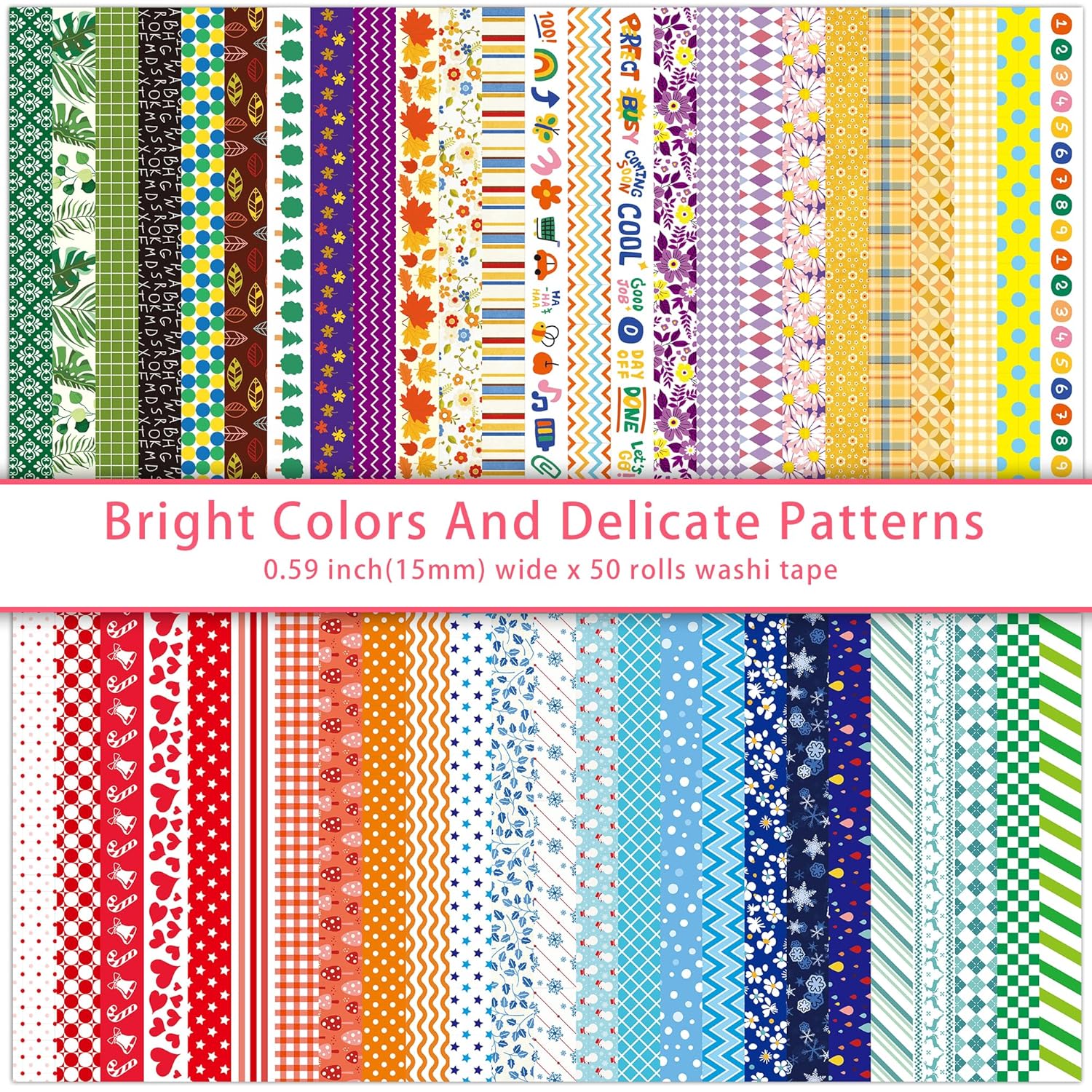 - 🌈Colored washi tape set includes 50 rolls with different patterns: 0.6 inch(15mm) wide x 10 feet(3m) long,total 492.1 feet(150m). This Colored washi tape adds color and vitality to the pasted items, making daily life more interesting.