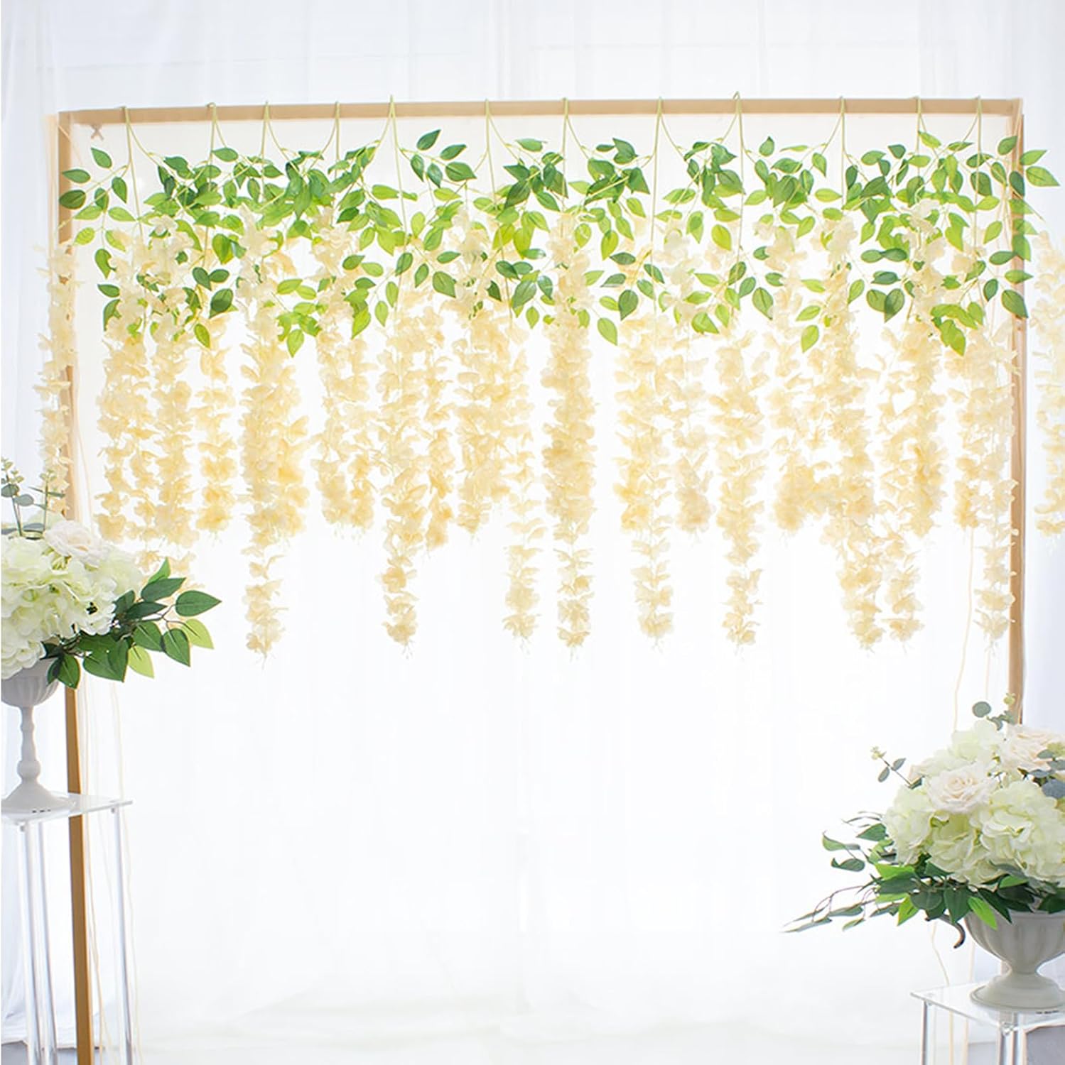 12 Pack Champagne Wisteria Hanging Flowers Garland, 3.77 Feet Artificial Flower Vines, Fake Wisteria, Artificial Vines Hanging Garland for Backdrop Outdoor Yard Garden Decor