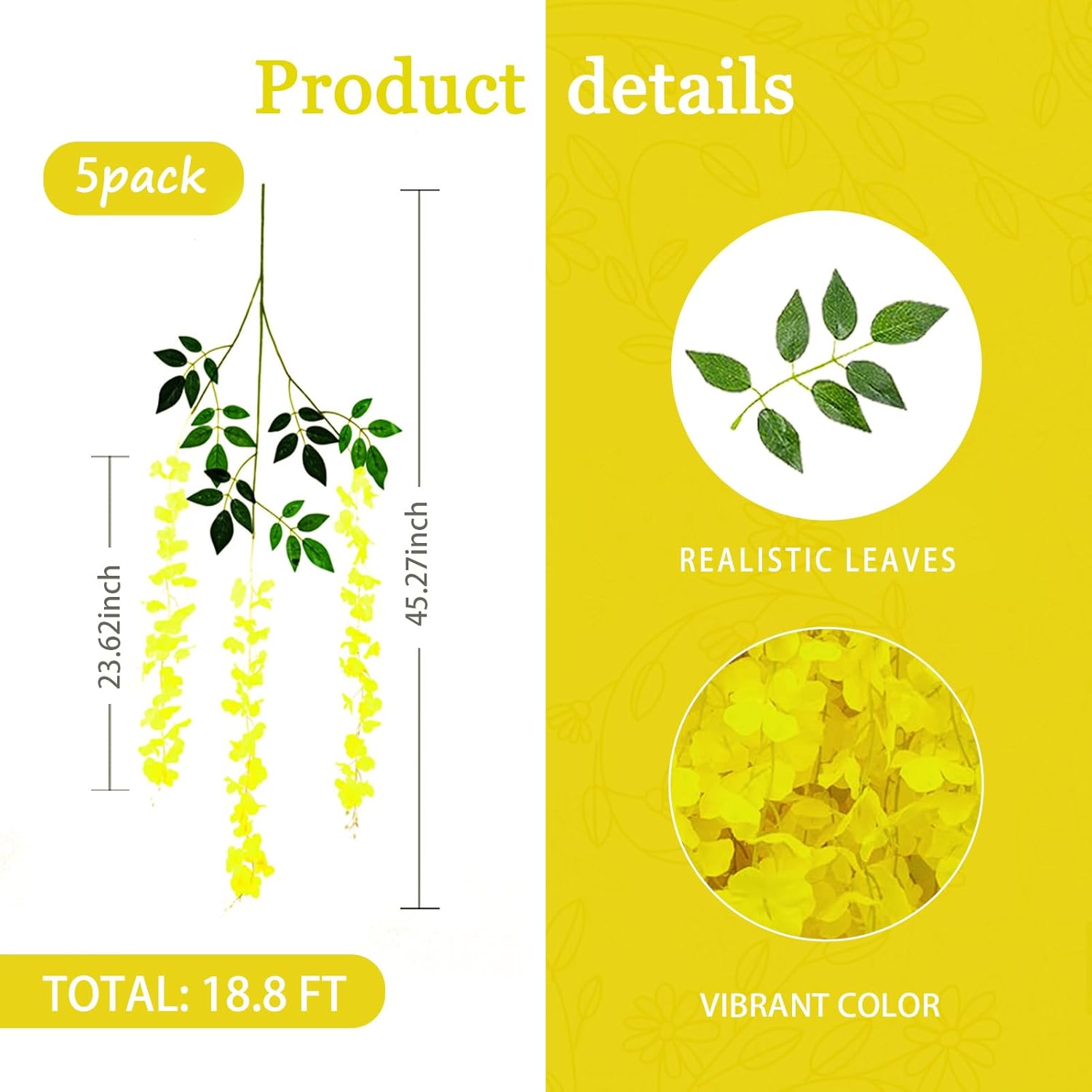- 【Package Included】5 pieces of silk yellow wisteria hanging flowers, each length 45.27 inches. Every artificial wisteria garland has 3 branches and 6 leaves, the wisteria flower petal length is 23.62 inches. (Note: There may be some color differences in different lights)
