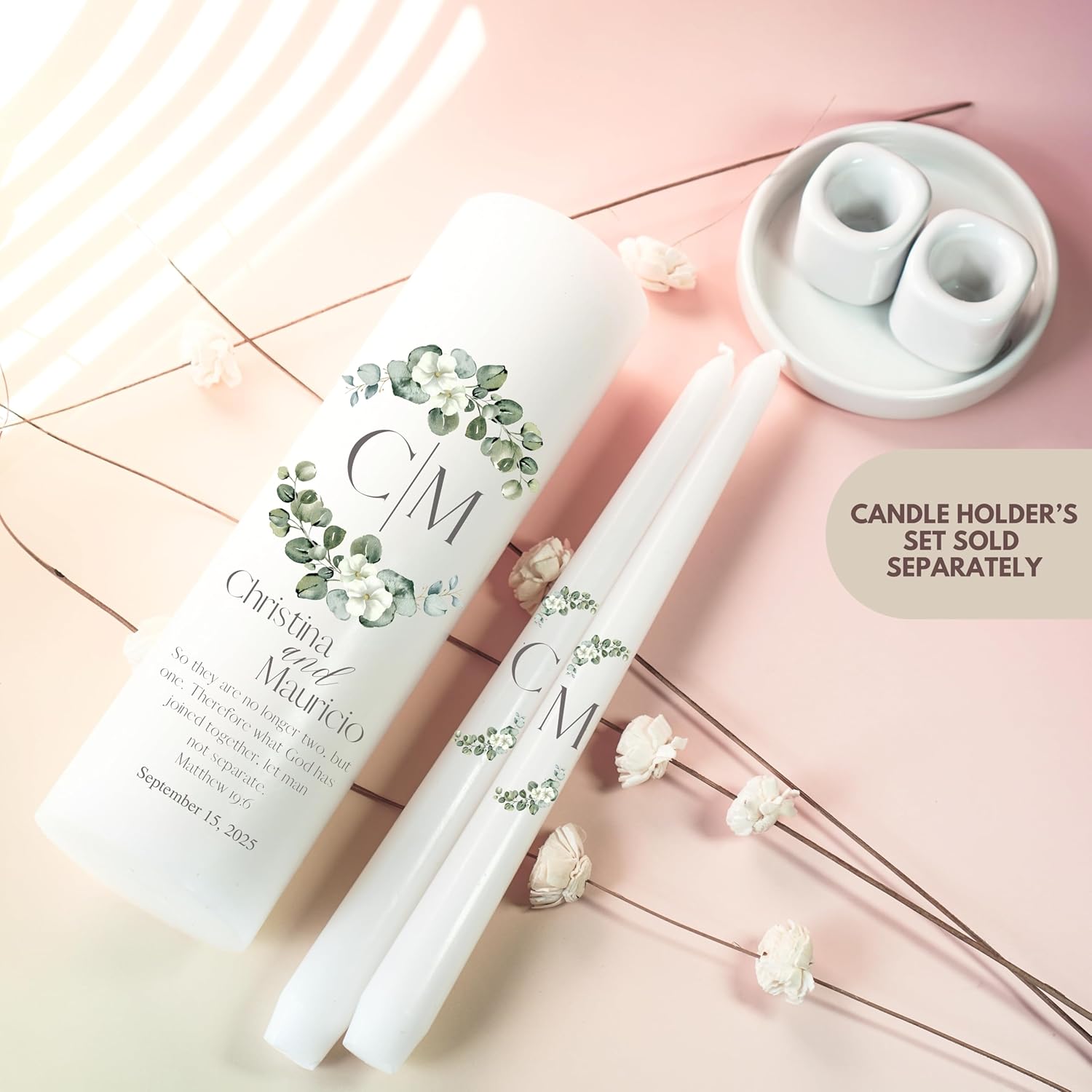 Unity Candles for Wedding, Modern Unity Set, Custom and Personalized Pillar and Taper Candles with Bible Quote, Unscented White Premium Wax, Religious and Wedding Ceremony, Special Events (Greenie)
