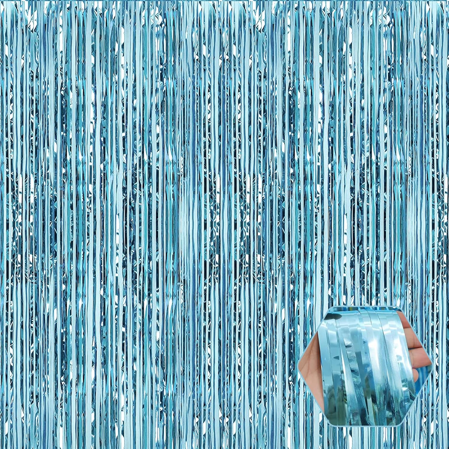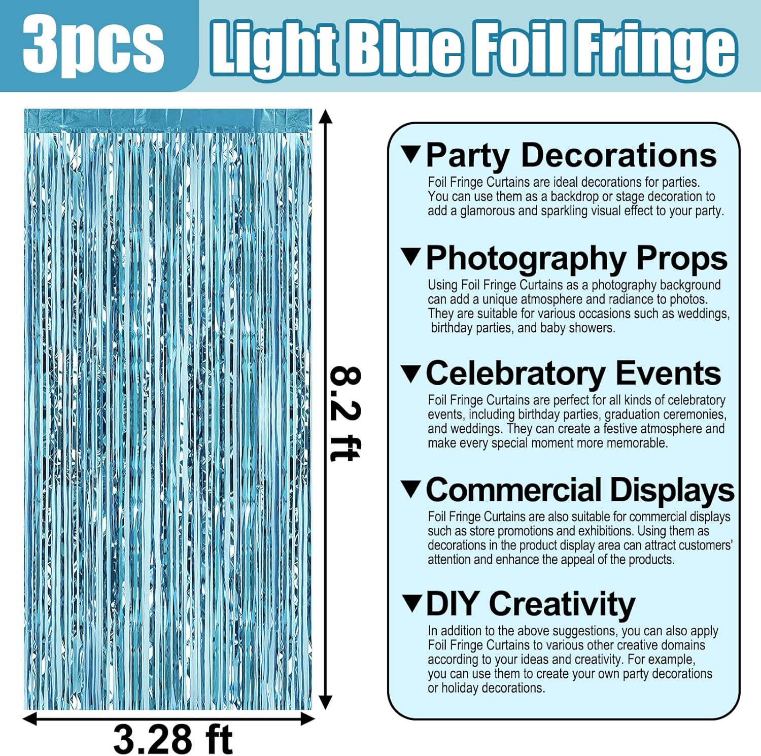 - 3.28Ft x 8.2Ft Feet | Vibrant Shiny Streamers : This sparkling tinsel blue fringe curtain is large size of 3.28ft x 8.2ft feet, pack of 3. Made of aluminium foil. This decorations for party backdrop will radiates laser like shine. and this will be a perfect party backdrop for the photo booth you had prepared for your friends and kids.