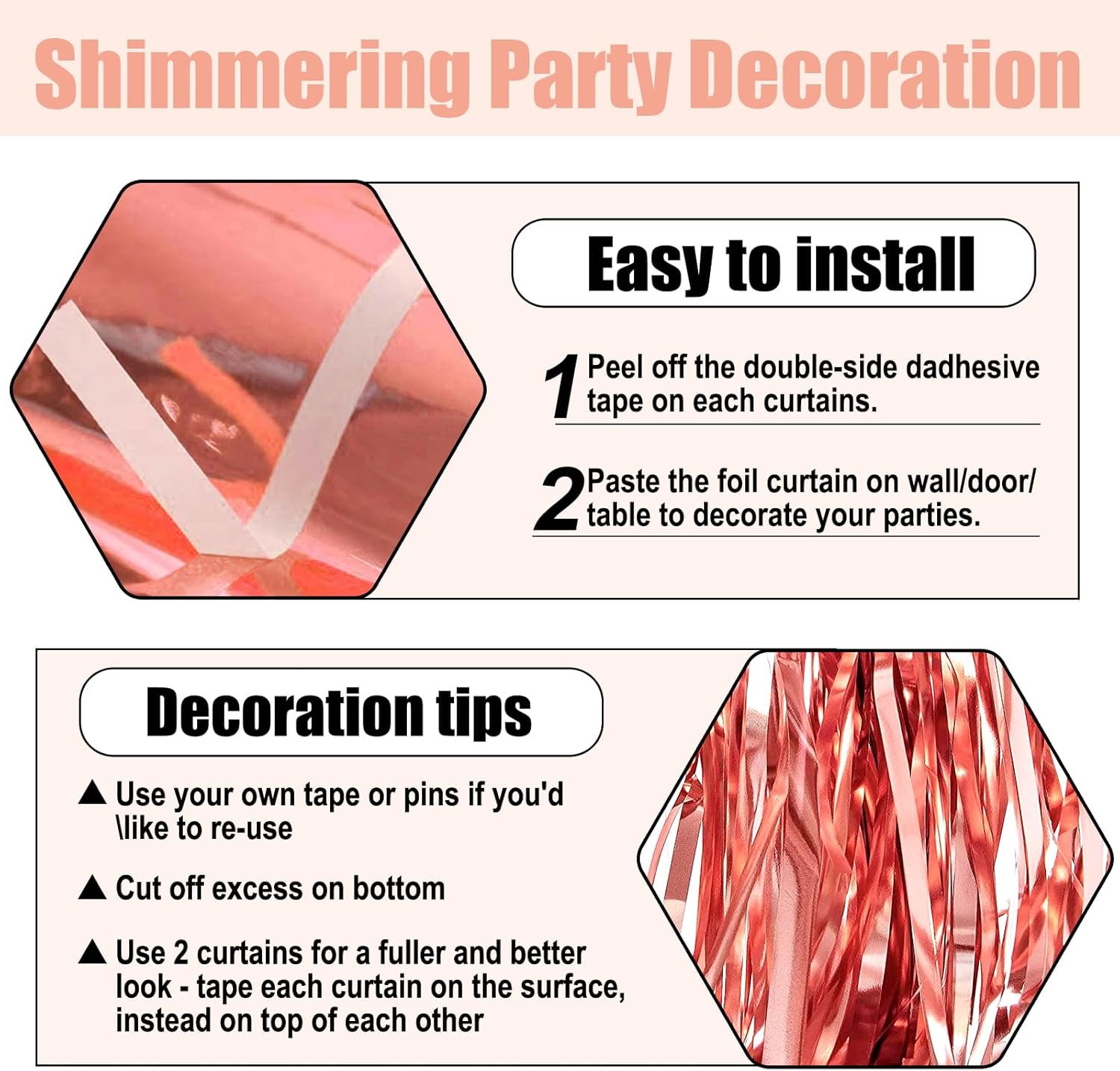- Easy To Assemble | Strong Adhesive | Not Easy Fade : The foil fringe curtain backdrop party decorations come with double-sided adhesive tape, easy to use, just tear off the back of adhesive tape, then paste this streamers backdrop curtains on the top of wall, window, table, or as door fringe decoration.