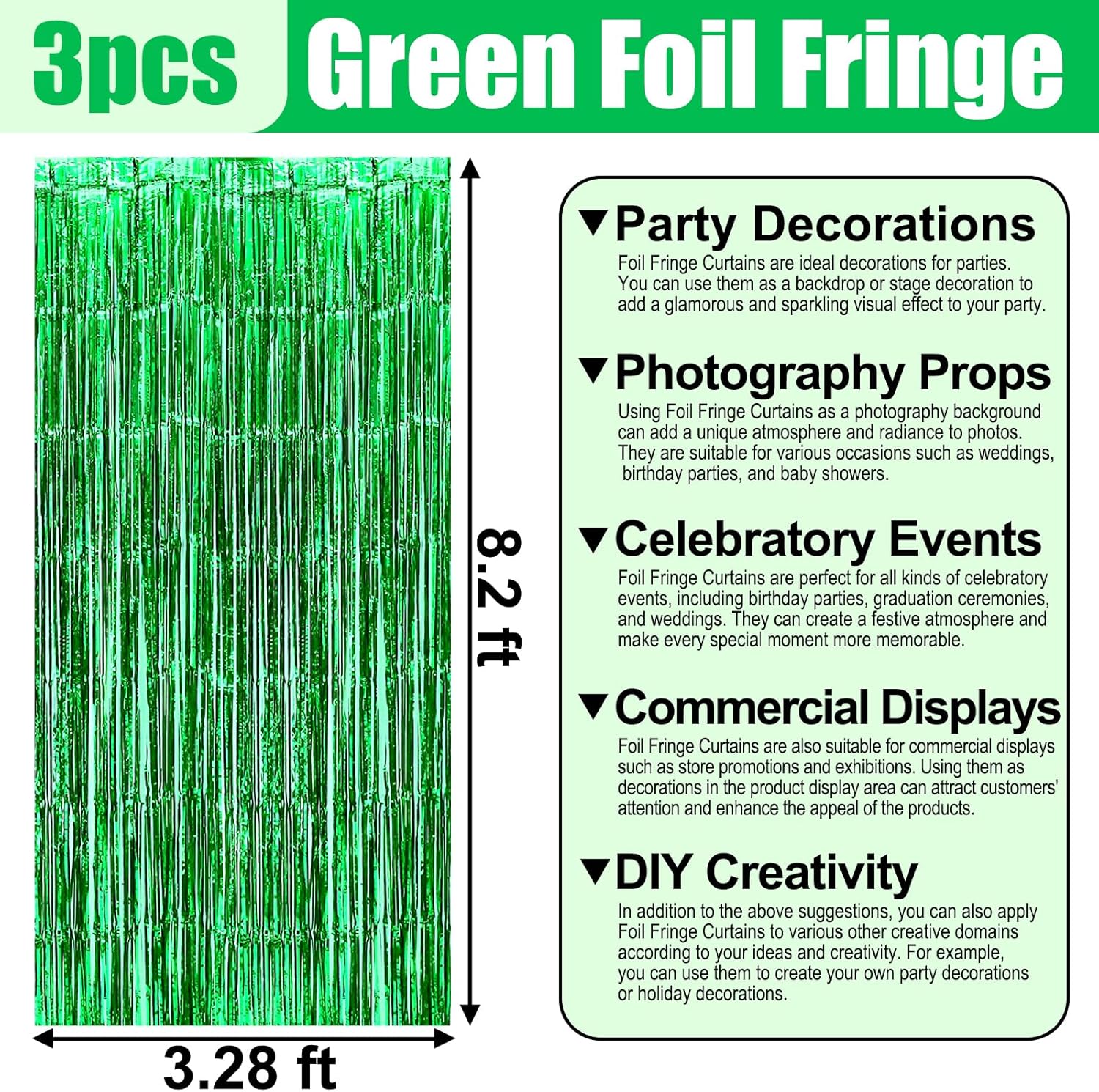 3 Pack Green Foil Fringe Curtain Backdrop, 3.28Ft x 8.2Ft Metallic Tinsel Foil Fringe Streamer Curtains for Photo Booth, Christmas Day, Thanksgiving, Wedding, New Year Party Decorations
