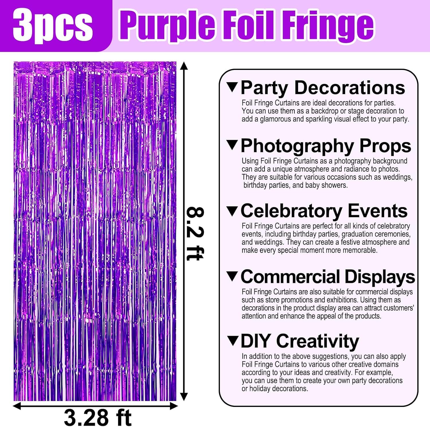3 Pack Purple Foil Fringe Curtain Backdrop, 3.28Ft x 8.2Ft Metallic Tinsel Foil Fringe Streamer Curtains for Photo Booth, Christmas Day, Thanksgiving, Wedding, New Year Party Decorations