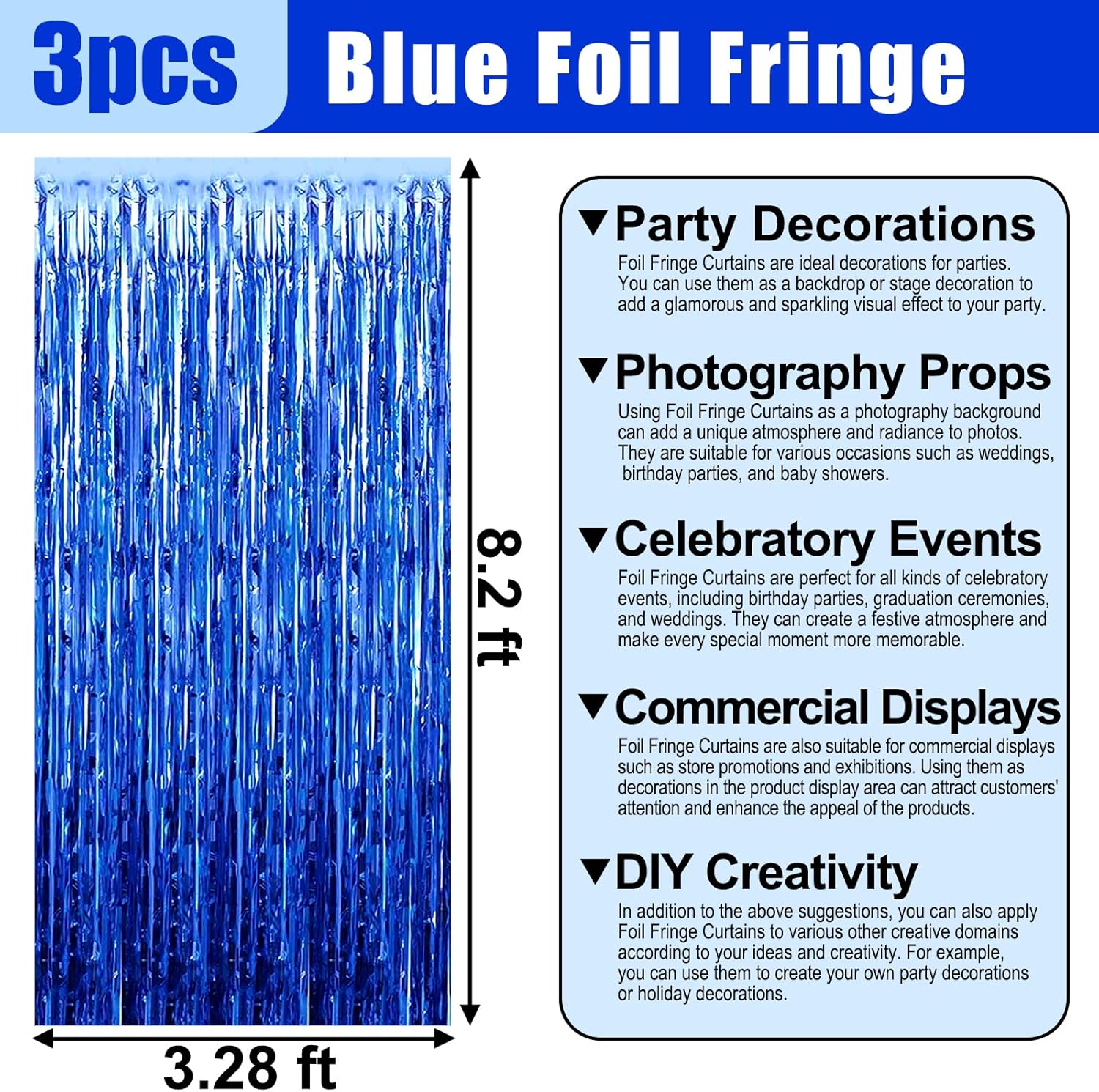 - 3.28Ft x 8.2Ft Feet | Vibrant Shiny Streamers : This sparkling tinsel blue fringe curtain is large size of 3.28ft x 8.2ft feet, pack of 3. Made of aluminium foil. This decorations for party backdrop will radiates laser like shine. and this will be a perfect party backdrop for the photo booth you had prepared for your friends and kids.