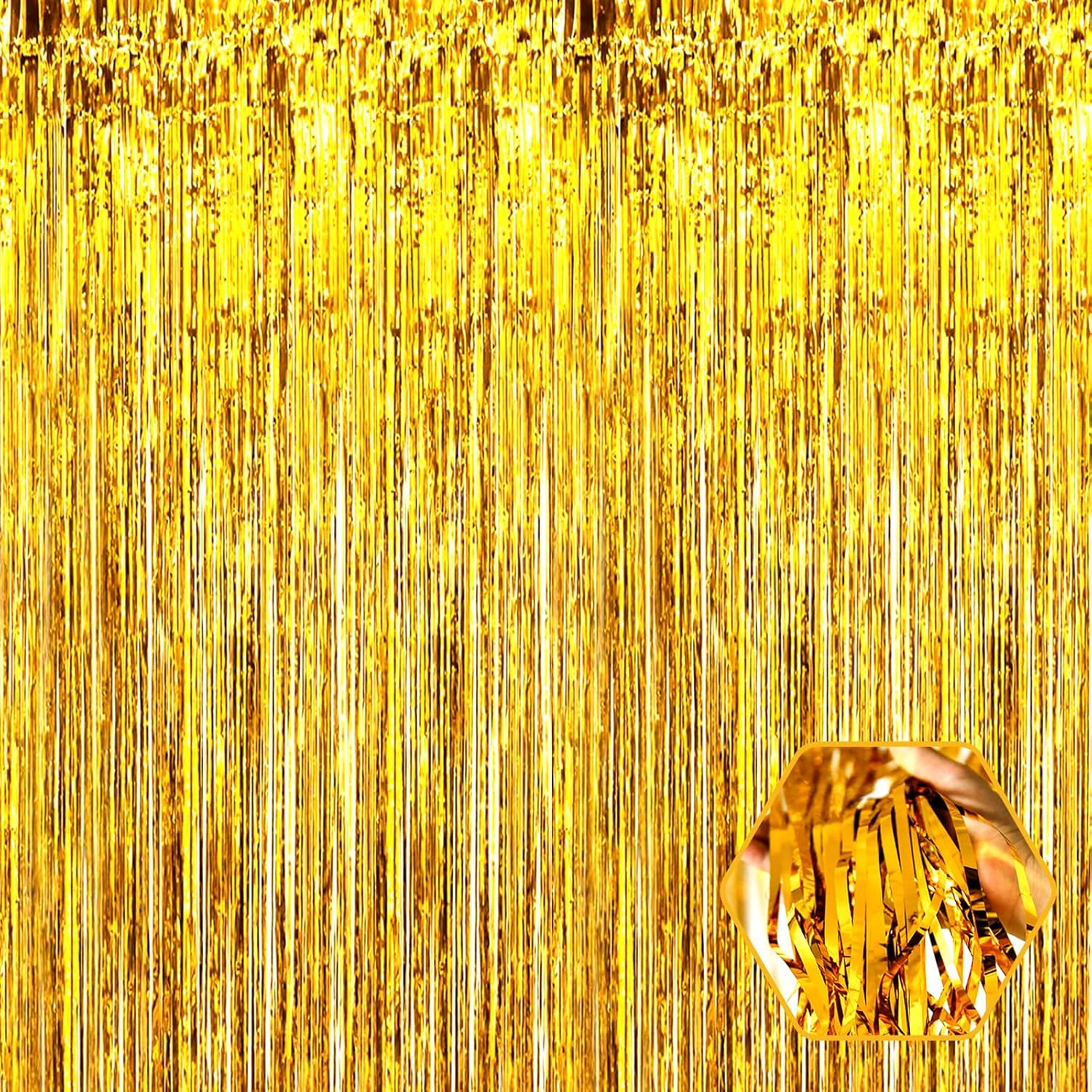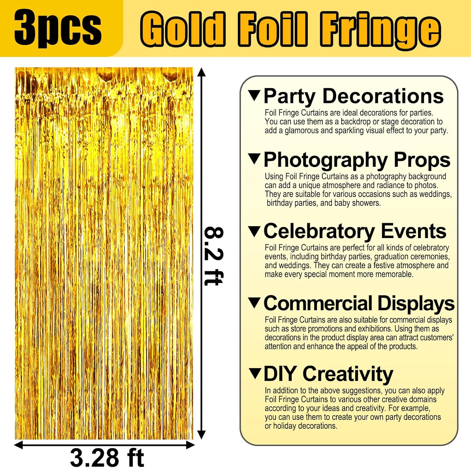 3 Pack Gold Foil Fringe Curtain Backdrop, 3.28Ft x 8.2Ft Metallic Tinsel Foil Fringe Streamer Curtains for Photo Booth, Christmas Day, Thanksgiving, Wedding, New Year Party Decorations
