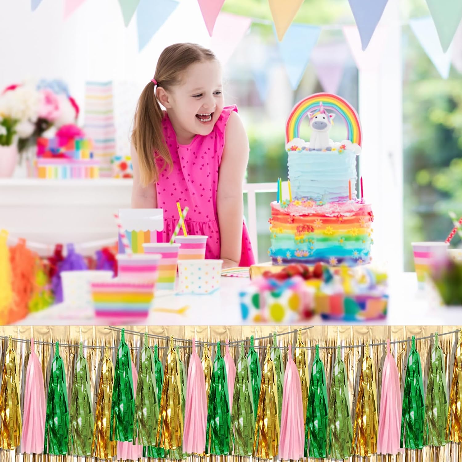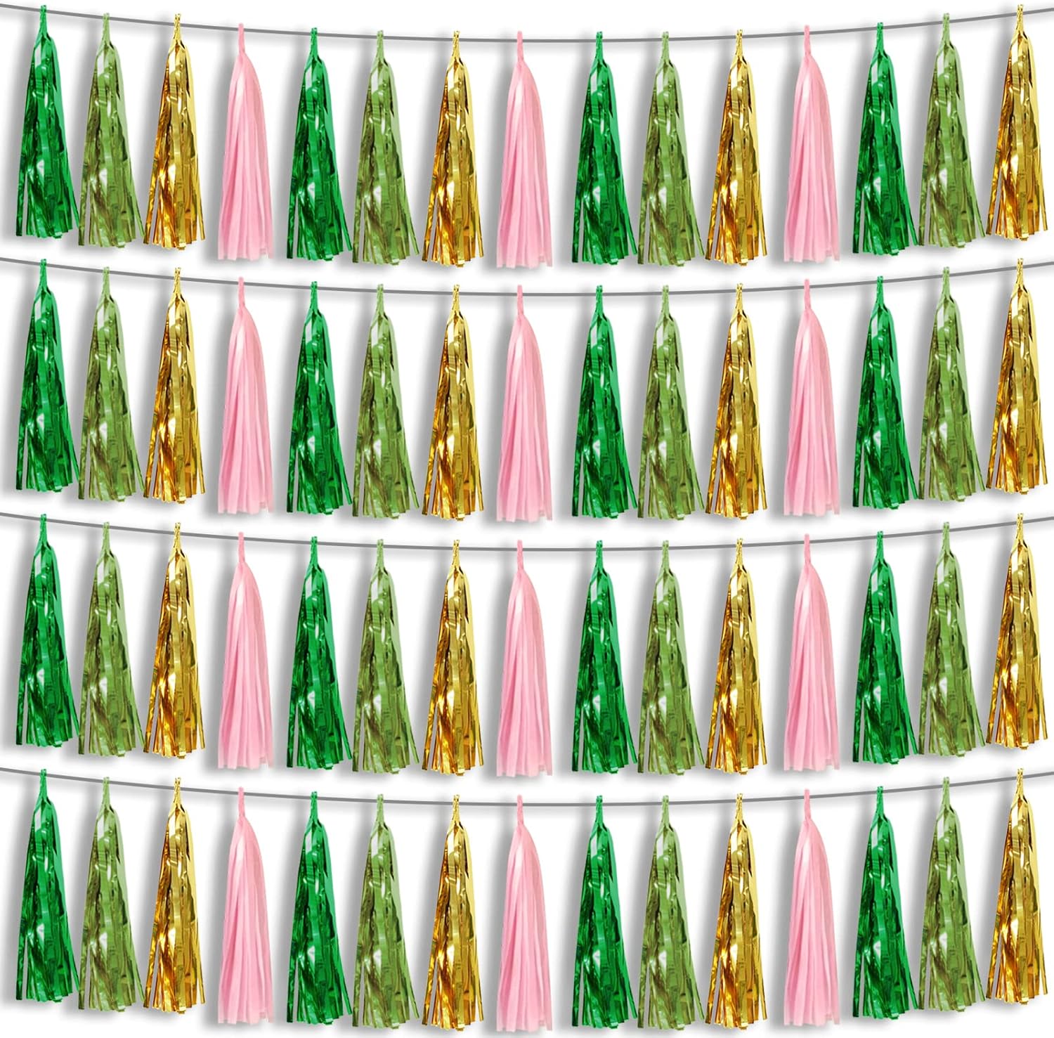 4P Pink-Gold Sage-Green Party-Decorations Foil Fringe Metallic Tassel Streamers Banner Tassel Garland for Parade Floats, Birthday, Bachelorette, Wedding, Halloween, Christmas