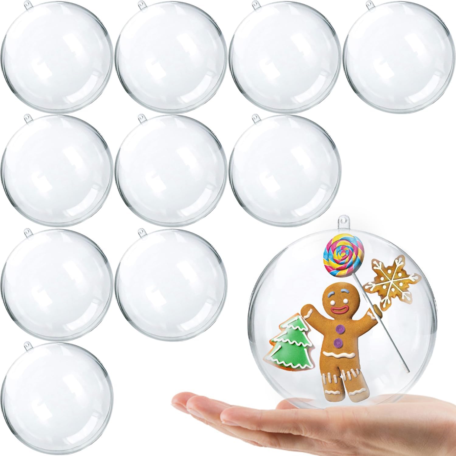 - PACK OF 10: Super value bulk of 10 sets clear plastic ornaments balls, come with total of 20 hemispheres, 10 female and 10 male, simple assembly to get 10 complete spheres balls. Our clear plastic ornaments is round ball globe shape, 100mm in outer diameter. Perfect size, not too big, and not too small.