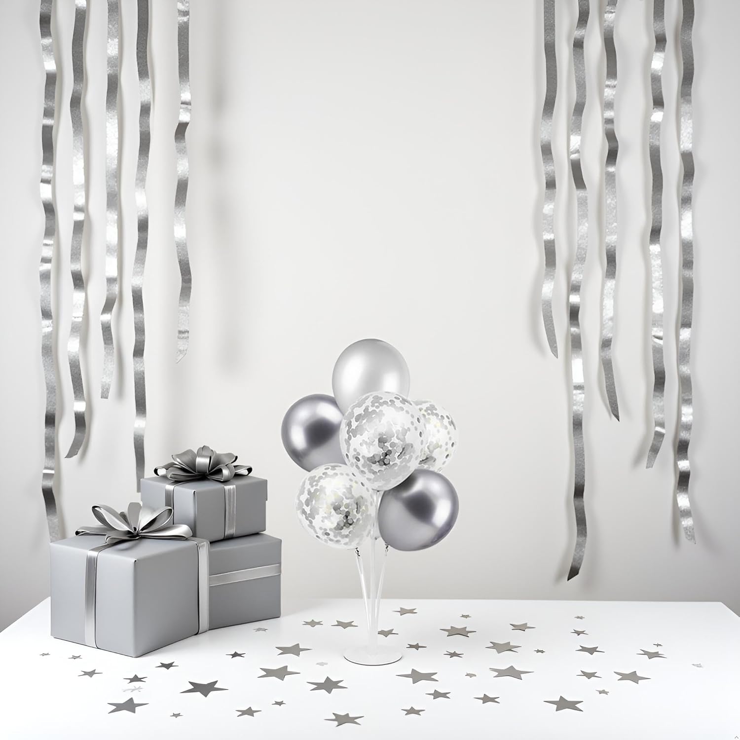 - WHAT INLCUDE: This balloon stand kit include 4 set balloon holders, 35 pcs balloons - silver and confetti balloons, gray balloons, balloon pump, ribbons, glue dots and tie tool
