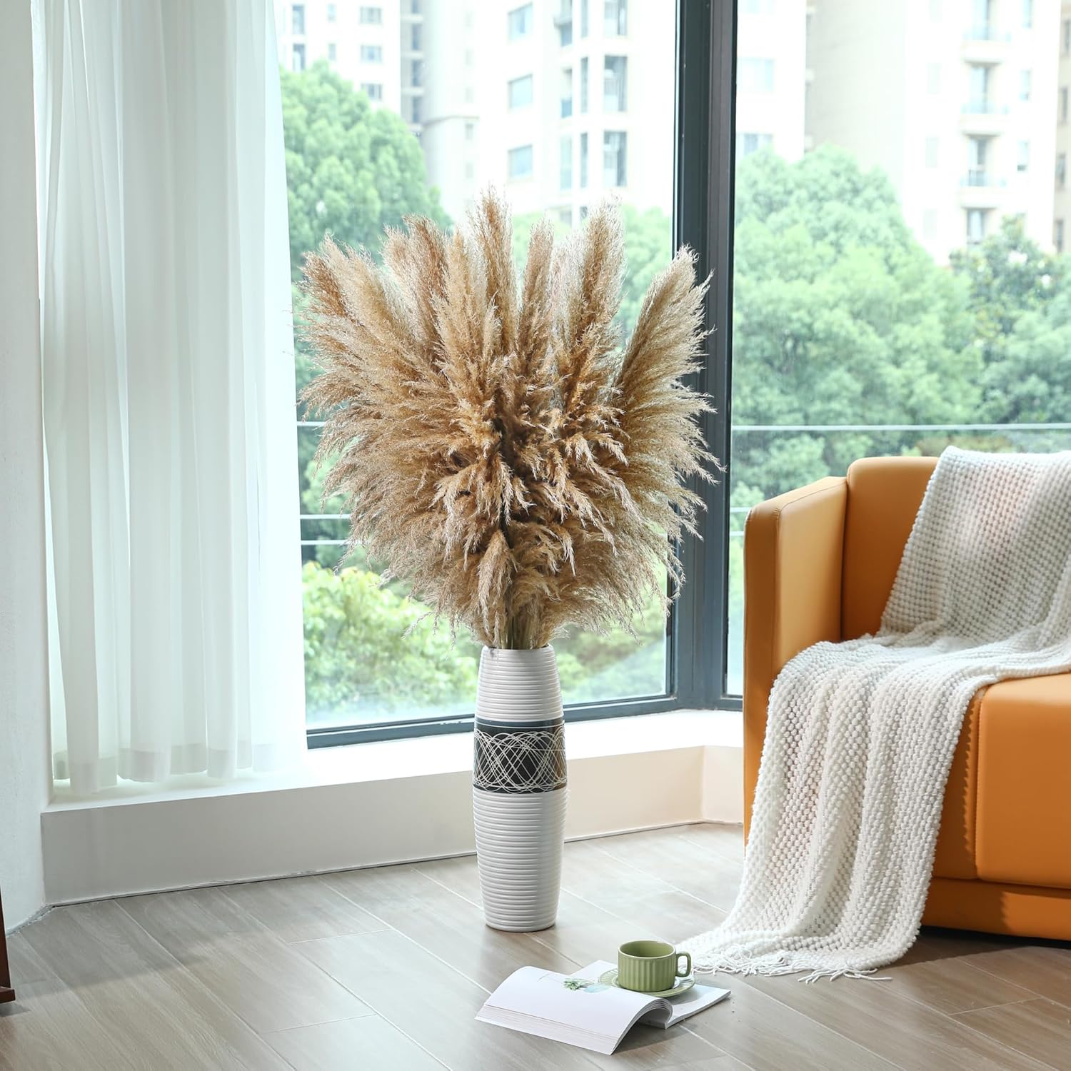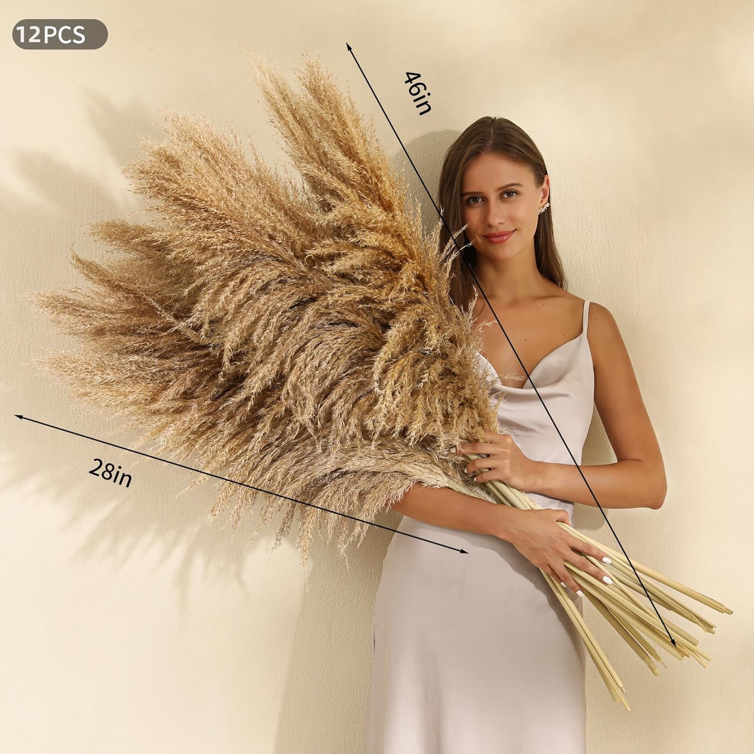 - 🌾【Quantity and Size】: Enjoy 12 stems of natural, extra tall pampas grass measuring approximately 46 inches in height, with plume lengths ranging from 28 inches. Fill your large floor vase or arrange them in two vases for a stunning display. Elevate your space with these luxurious, high-quality pampas grass stems.