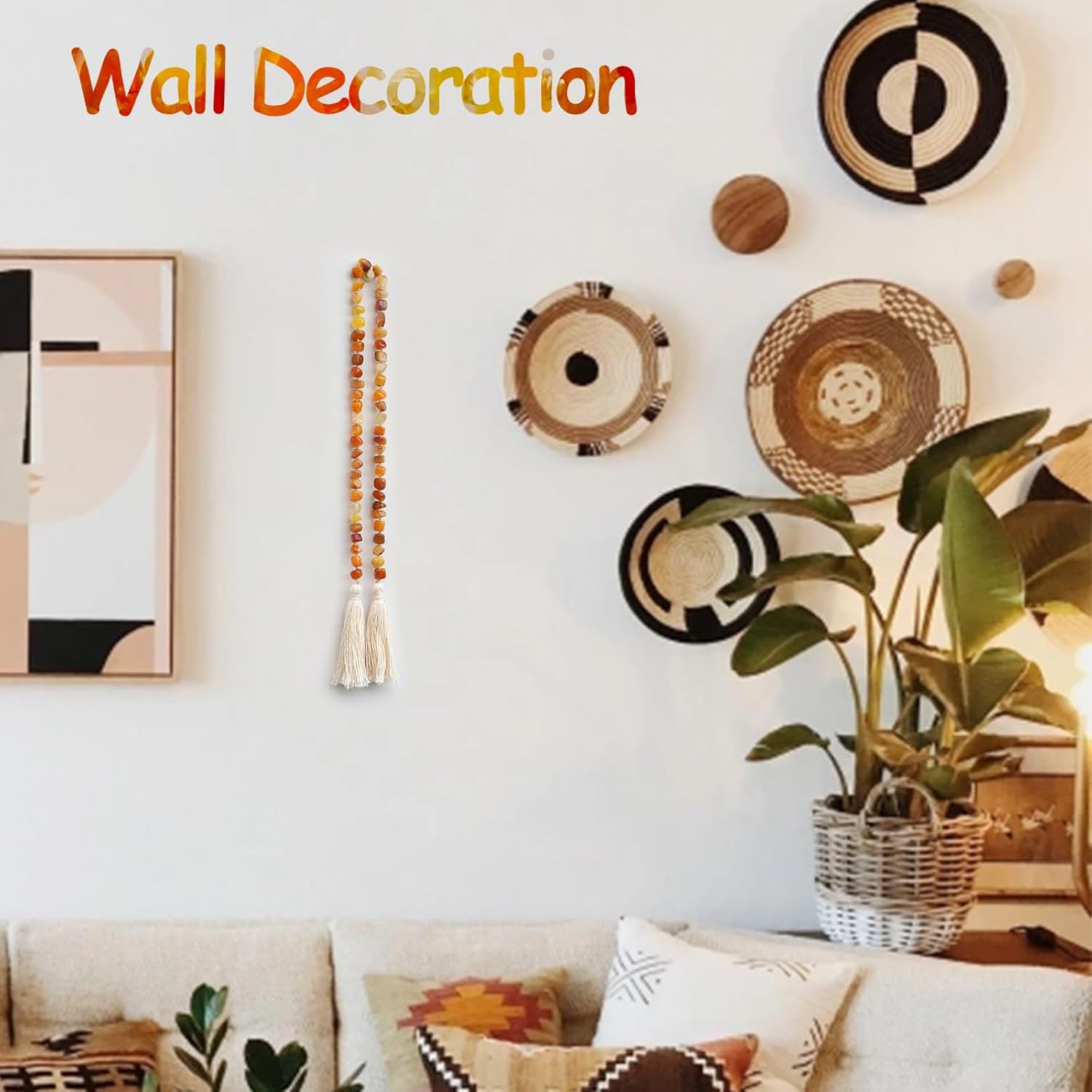 Agate Stone Hand Knotted Garland Modern Farmhouse Rustic Table Home Decor, 30inch Meditation Accessories with Tassel, Prayer Healing Beads Boho Wall Shelf Hanging Decoration (Orange)