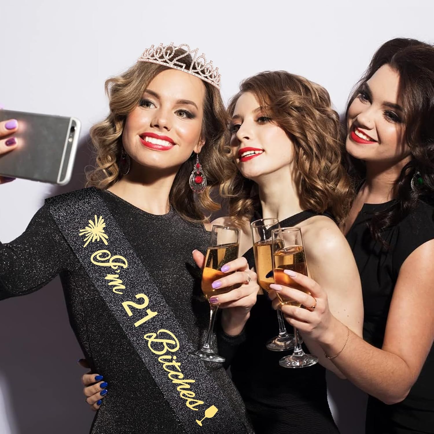 - 21st Birthday Decorations Set: Coming with Black Glitter “I am 21 Bitches” Sash, Rhinestone 21st Birthday Crown Rose Gold, Happy 21 Birthday Cake Topper and Rose Gold 21 Birthday Candles for 21st Birthday, and a classical birthday card, all has been packed in a cute gift box for ready to impress the 21 birthday girl.