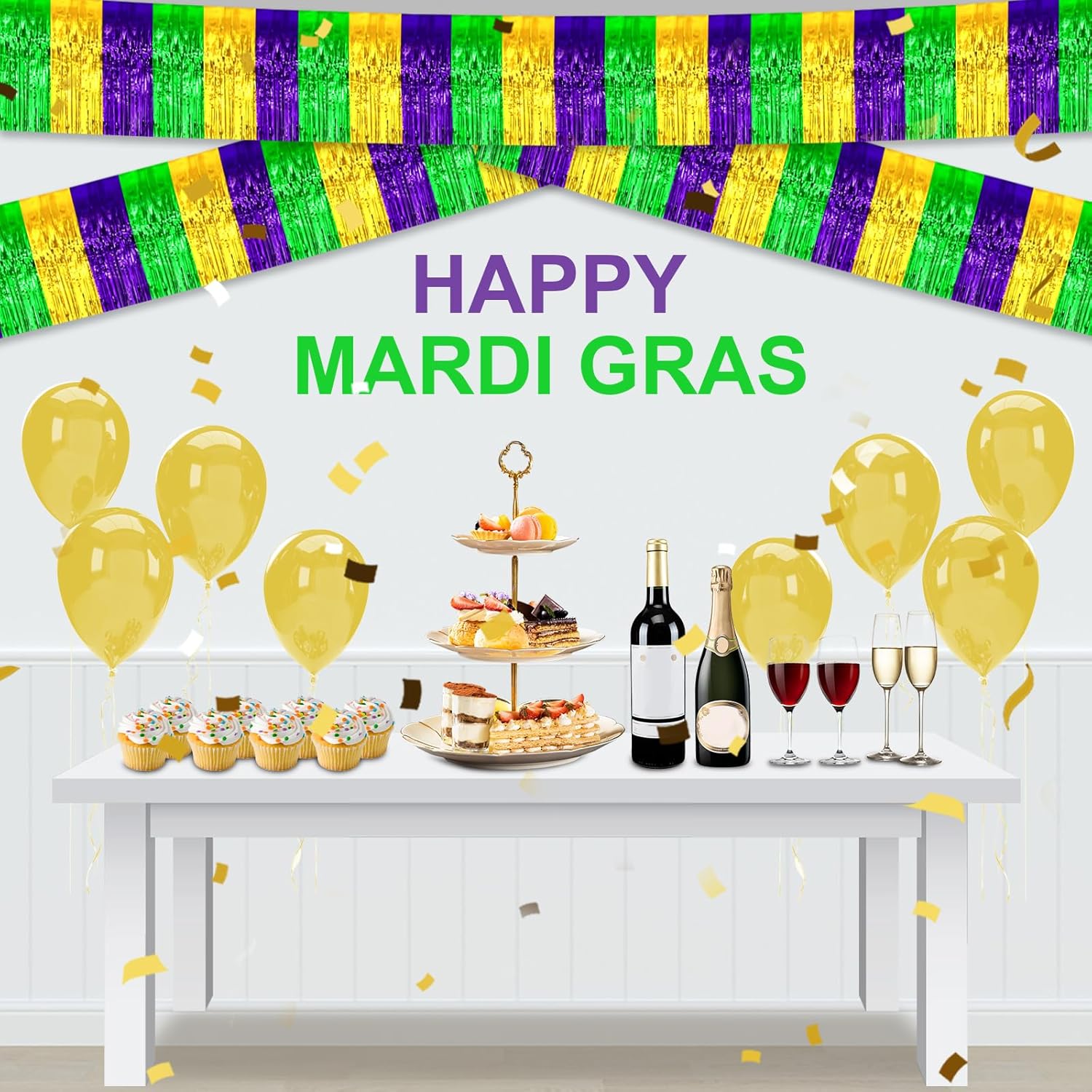 4 Pack 10 Feet Gold Green Purple Foil Fringe Garland Metallic Tinsel Streamers Banner Wall Hanging Curtain Backdrop for Parade Floats, Wedding, Graduate, Mother's Day, Birthday Party Decoration