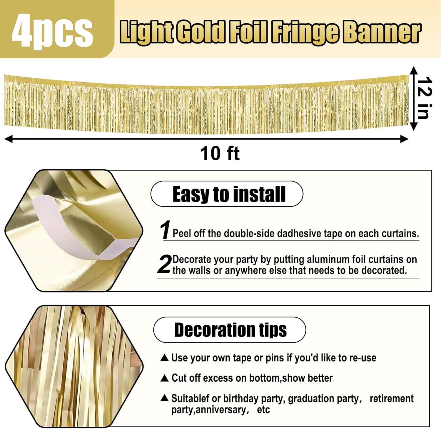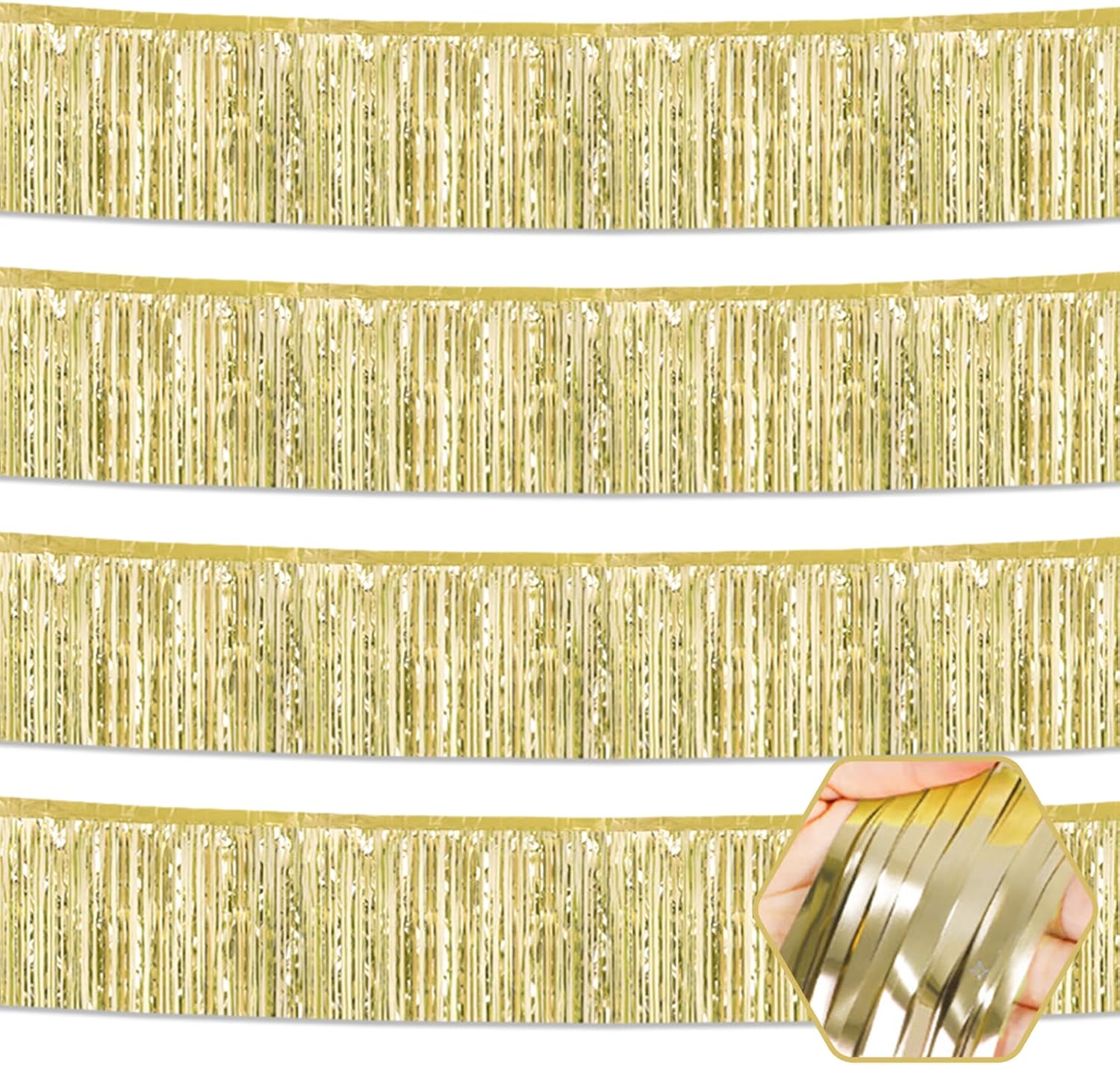4 Pack 10 Feet Light Gold Foil Fringe Garland Metallic Tinsel Streamers Banner Wall Hanging Curtain Backdrop for Parade Floats, Wedding, Graduate, Mother's Day, Birthday Party Decoration