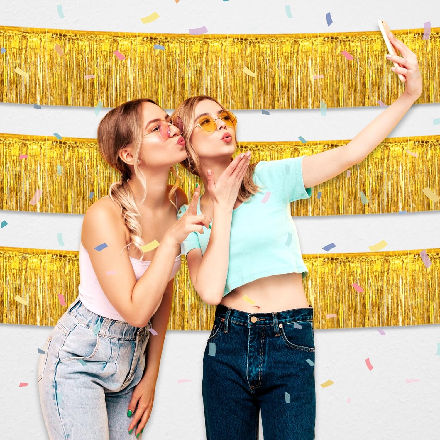 4 Pack 10 Feet Gold Foil Fringe Garland Metallic Tinsel Streamers Banner Wall Hanging Curtain Backdrop for Parade Floats, Wedding, Graduate, Mother's Day, Birthday Party Decoration