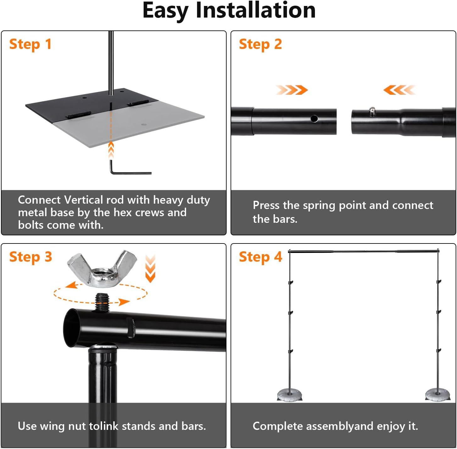 - The Kit included 2 x Heavy Metal Base, 2 x Support Sand, 2 x Cross Bar, 2 x wing nut,4 x Spring Clamps, 2 x Water weight bag,2 x Screw,1 x Wrench,1 x Carrying Case. Professional heavy duty photo backdrop stand kit, Meet your party's decorative need and create a romantic and beautiful party atmosphere,Whether Indoors or Outdoors Active.