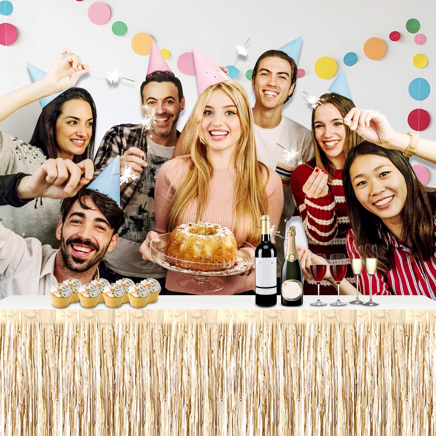 - Specifications and dimensions:3 Packs metallic foil tassel table skirt 29x108 inches, which is enough to decorate your party, provide you with excellent Convenient installation: the table skirt is equipped with self-adhesive tape. Just tear off the tape and paste it. The installation is convenient and quick. It can be pasted on the edge of your round table and square table. It can be easily cut into any siz.