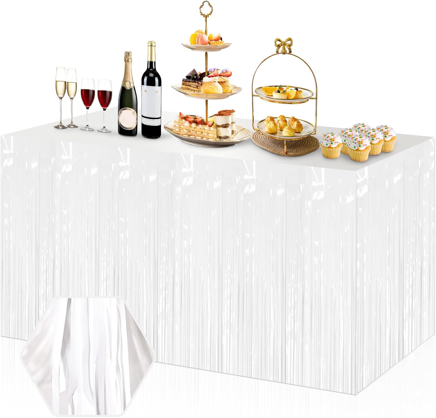 - Specifications and dimensions:3 Packs metallic foil tassel table skirt 29x108 inches, which is enough to decorate your party, provide you with excellent Convenient installation: the table skirt is equipped with self-adhesive tape. Just tear off the tape and paste it. The installation is convenient and quick. It can be pasted on the edge of your round table and square table. It can be easily cut into any siz.
