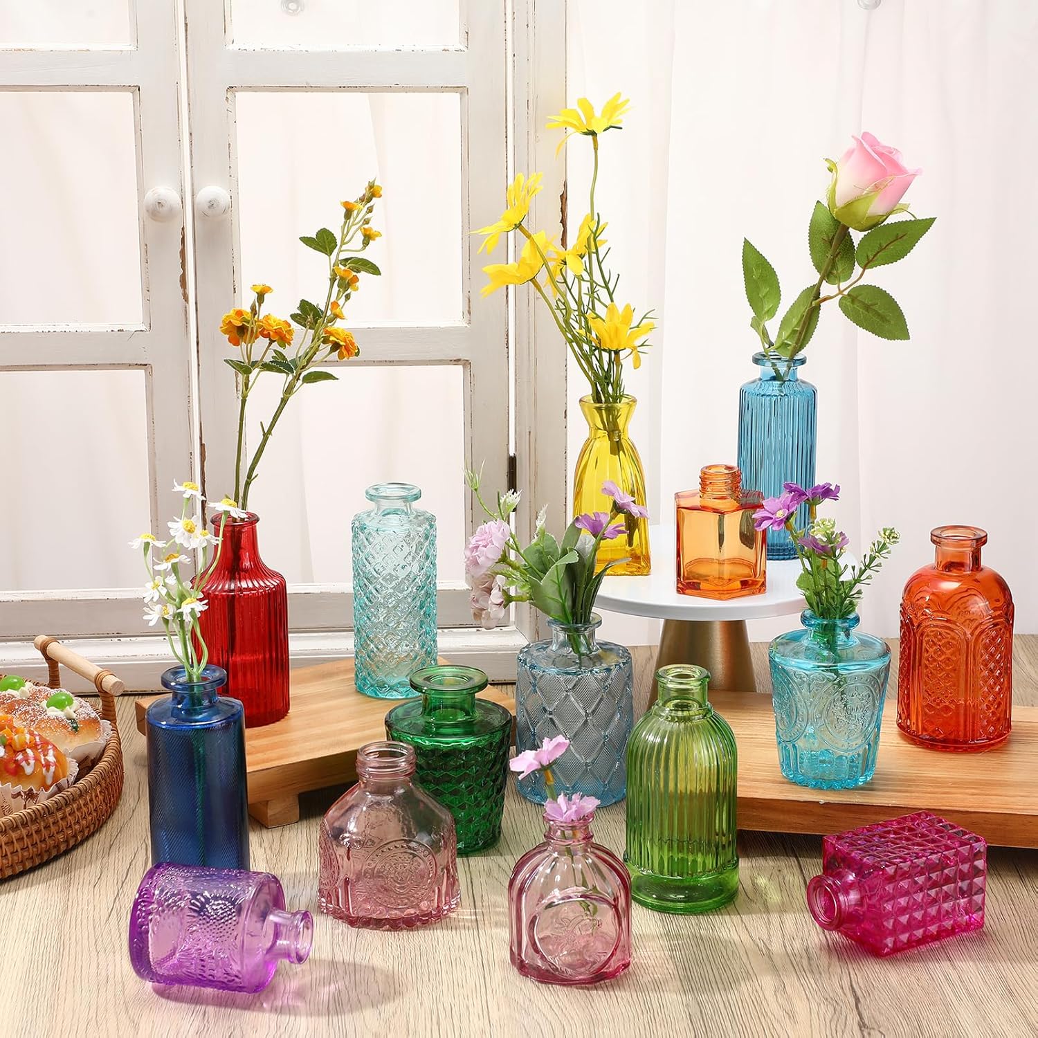 Yaomiao 30 Pcs Vases Bulk Colored Flower Glass Vases Bud Vintage Colored Glass Bottles Colorful Rustic Embossed for Home Wedding Table Decorations Gifts(Bright Color)