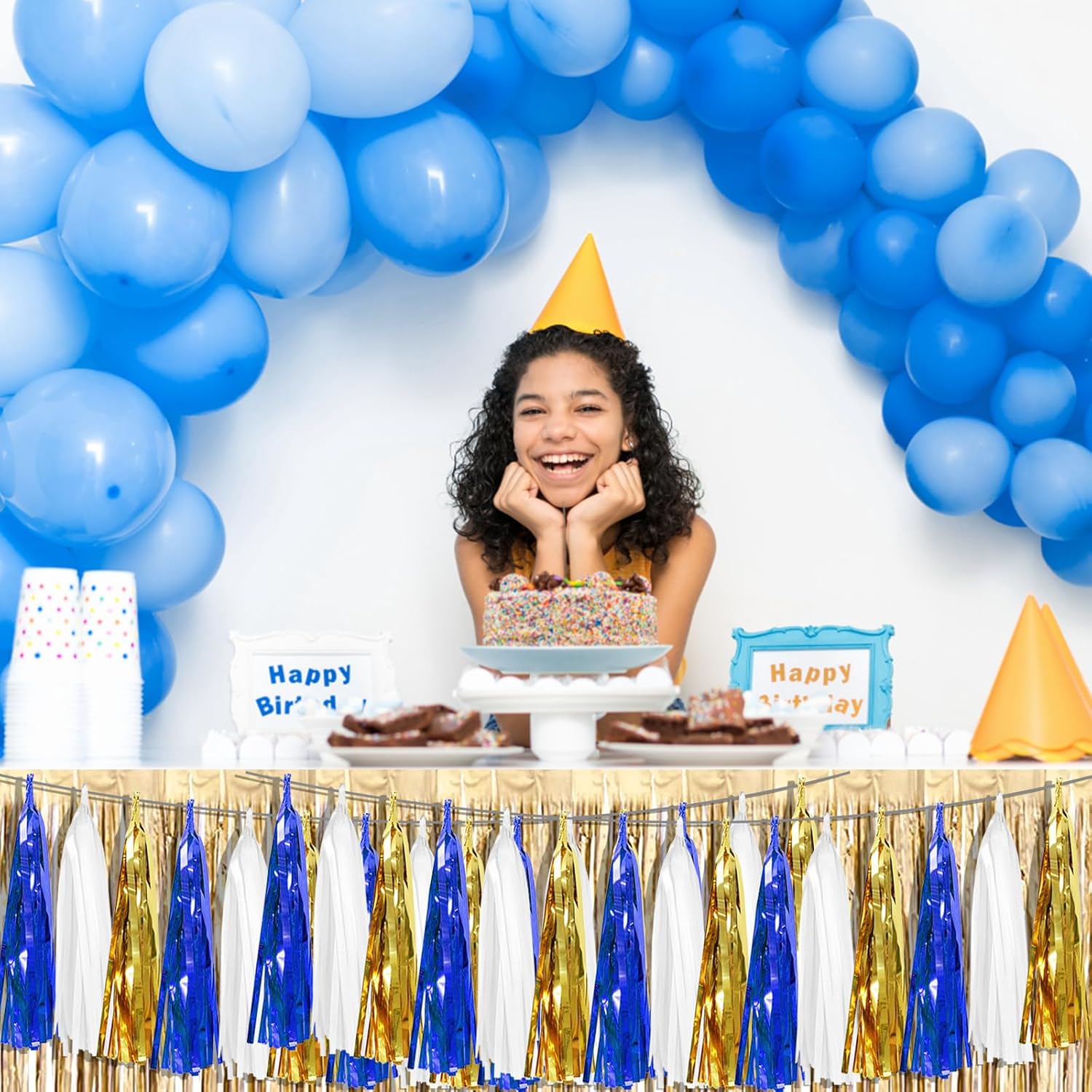 - 【Navy Blue White Gold Party Supplies Set】: The total length of the navy blue white gold birthday tassels banner is 59 feet, divided into 6 strips, each 9.8 feet long. Each banner contains 15 tassels, and each tassel measures 14 inches, for birthday decorations many occasions, and so on