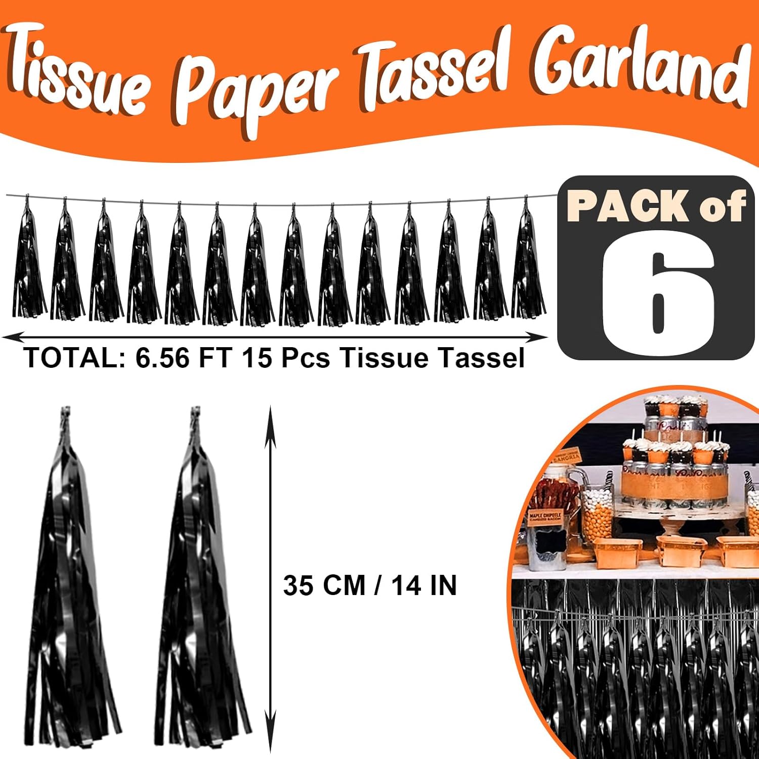 - 【Black Party Supplies Set】: The total length of the black birthday tassels banner is 59 feet, divided into 6 strips, each 9.8 feet long. Each banner contains 15 tassels, and each tassel measures 14 inches, for birthday decorations many occasions, and so on