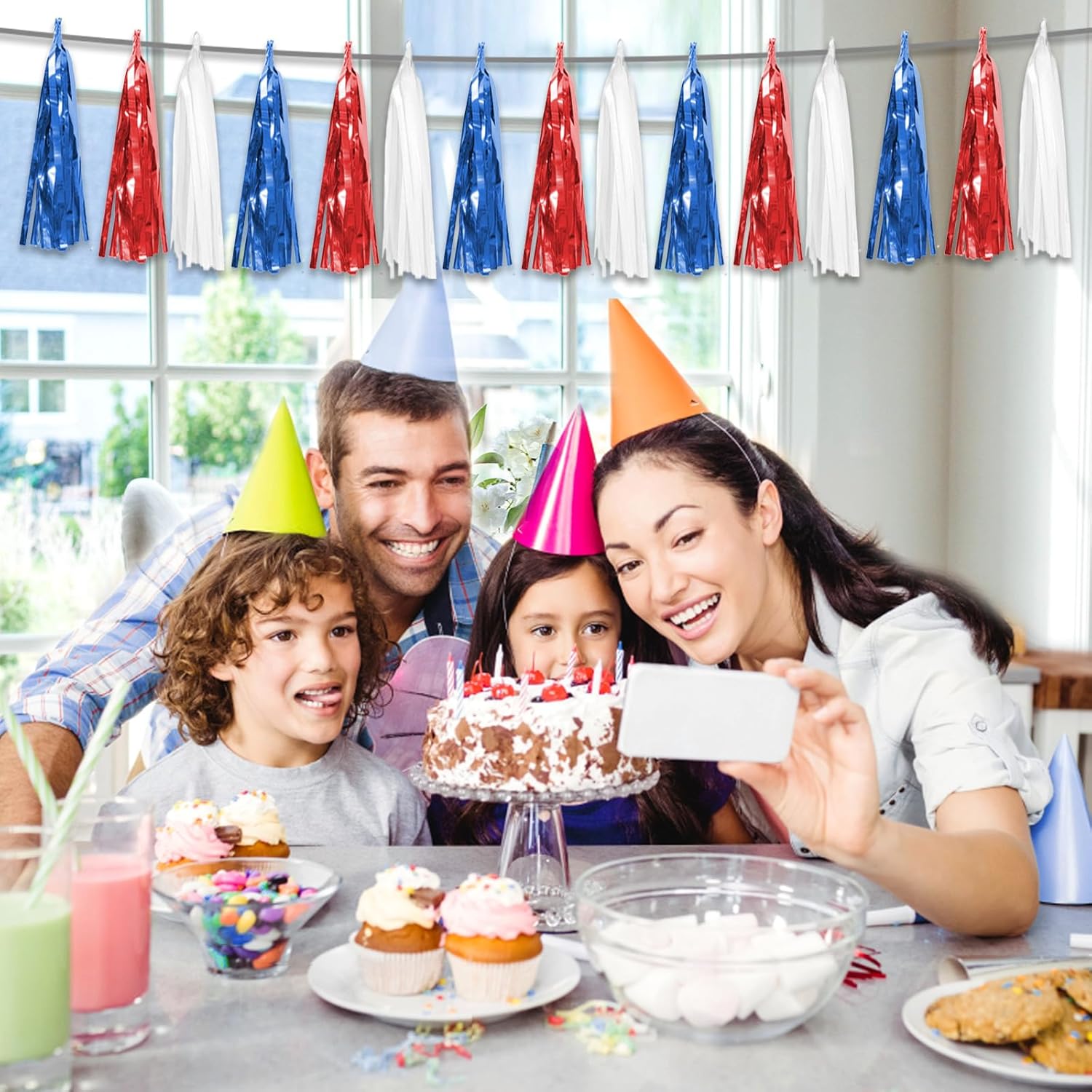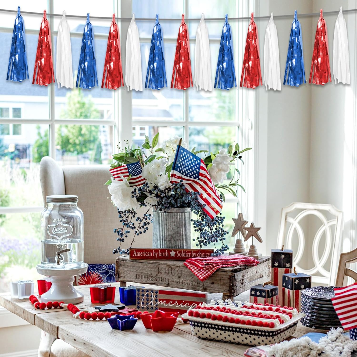 - 【Perfect Party Decoration】The Red Bule White tinsel garlands are designed in a metallic Fringe, bright, and beautiful, at the same time, they shine in the sun, and these gorgeous tassel garlands create a wonderful backdrop or centerpiece for your party space. and bring you, your family, and your friend's good Visual effects. your party many emotional and touching moments where a lot of pictures will be taken and everybody will have a wonderful time together.