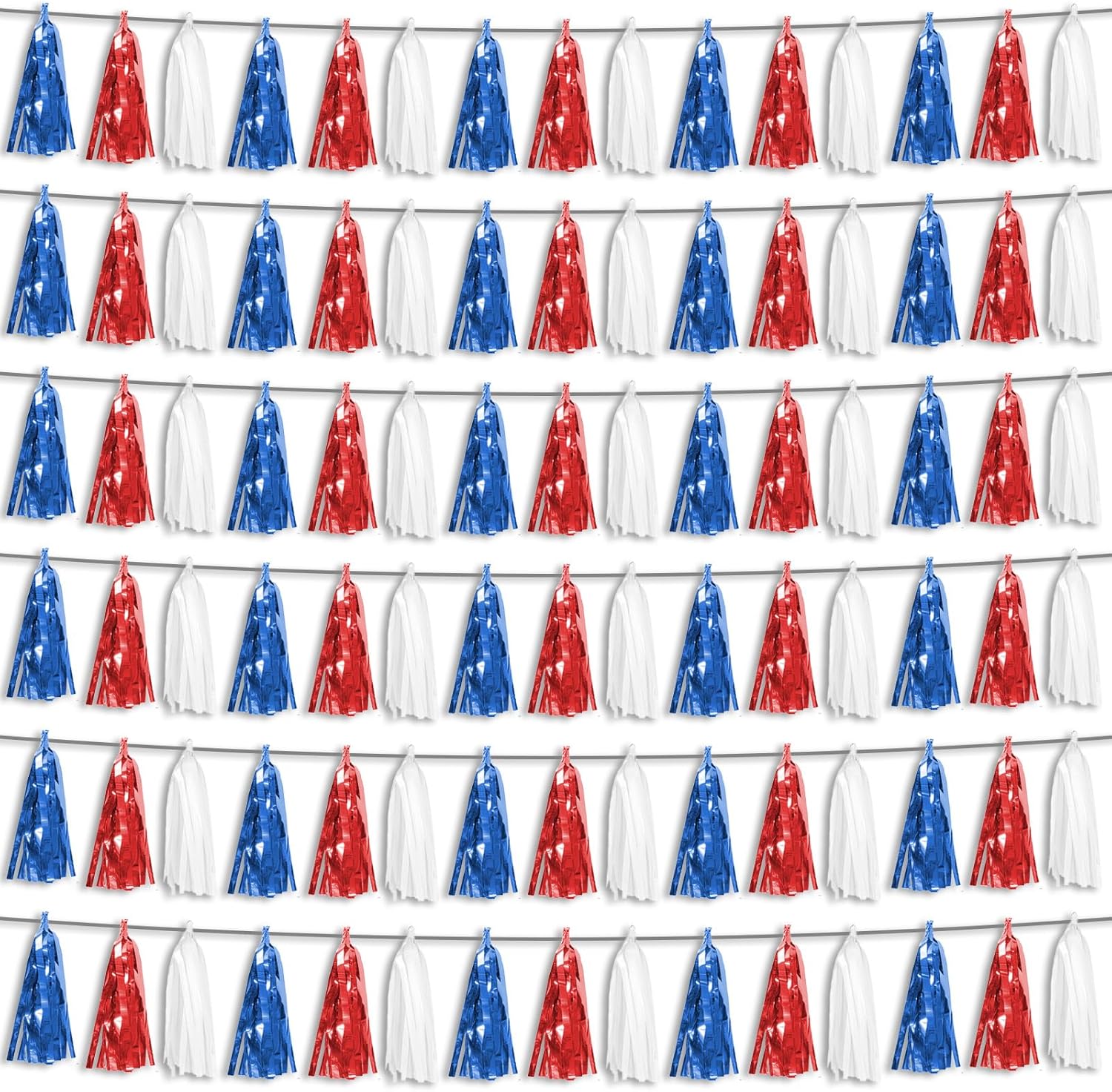 6P Red Blue White Foil Fringe Metallic Tassel Streamers Banner Tassel Garland for Parade Floats, Bachelorette, Wedding, Birthday, Graduation, Christmas, Bridal/Baby Shower Party Decorations