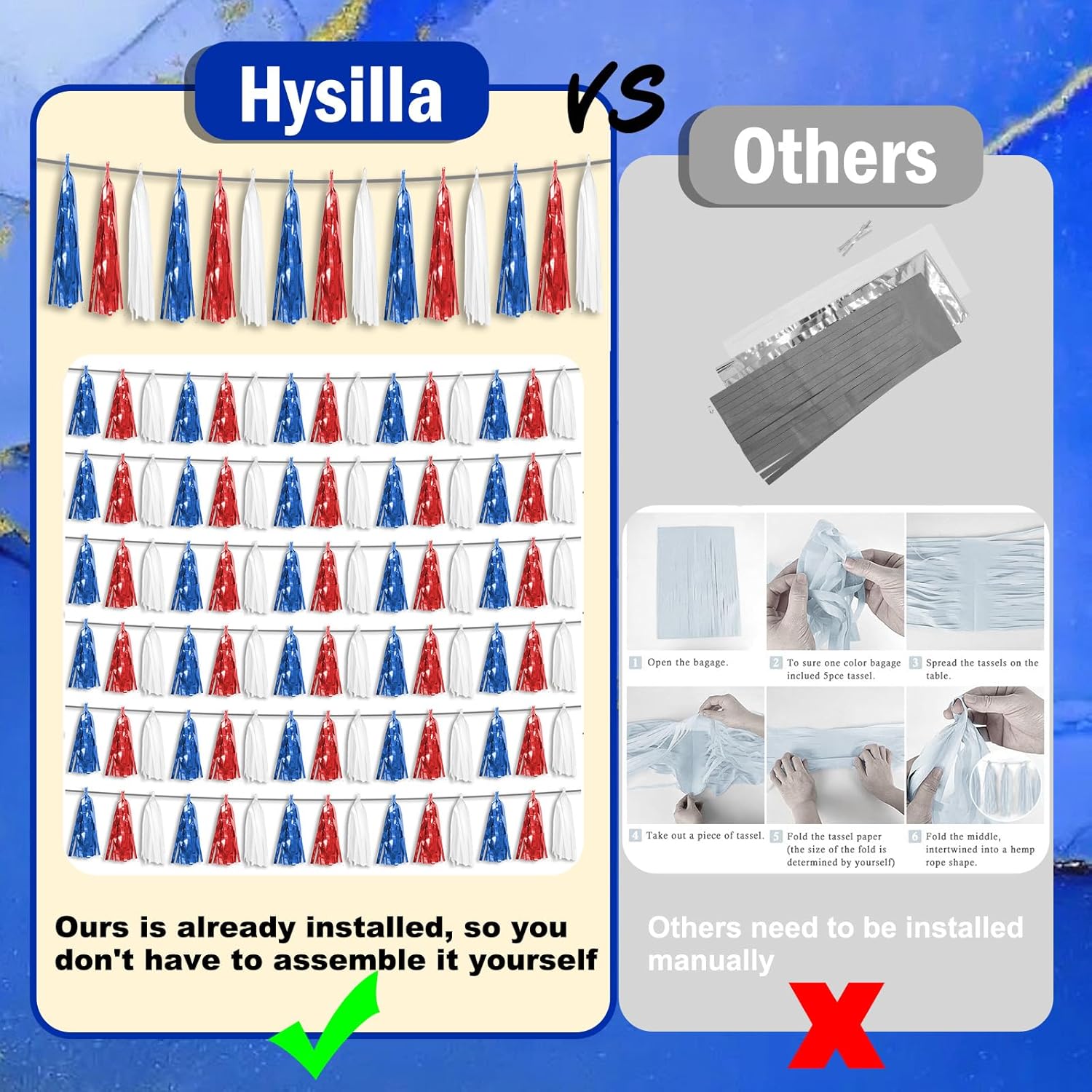 - 【Red Bule White Party Supplies Set】: The total length of the Red Bule White birthday tassels banner is 59 feet, divided into 6 strips, each 9.8 feet long. Each banner contains 15 tassels, and each tassel measures 14 inches, for birthday decorations many occasions, and so on